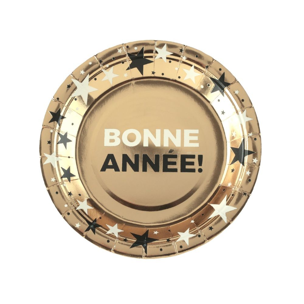 Réf. : ART-085714 Lot de 10 assiettes en carton doré, avec inscription Bonne Année et étoiles en bordure, pour votre réception de la Saint Sylvestre. Diamètre : 17,5 cm. Leur finition métallisée et leurs motifs apportent une touche chic et festive à vos repas du Nouvel An. Parfaites pour vos desserts, amuse-bouches ou apéritifs, elles allient élégance et praticité pour célébrer l'arrivée de la nouvelle année avec éclat.