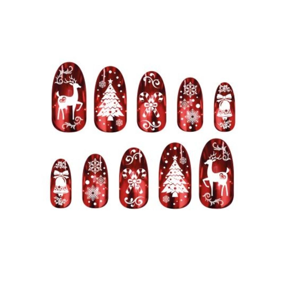 Réf. : ART-085609 Lot de 10 faux ongles pour adulte, rouge brillant décorés de motifs de Noël, afin de finaliser votre look de fête. Rennes, sapins et flocons s'invitent sur vos mains pour un look festif et glamour. Avec leur surface adhésive, ils se positionnent facilement et rapidement. Un détail qui marque votre volonté de vous investir pleinement, jusqu'au bout des ongles.