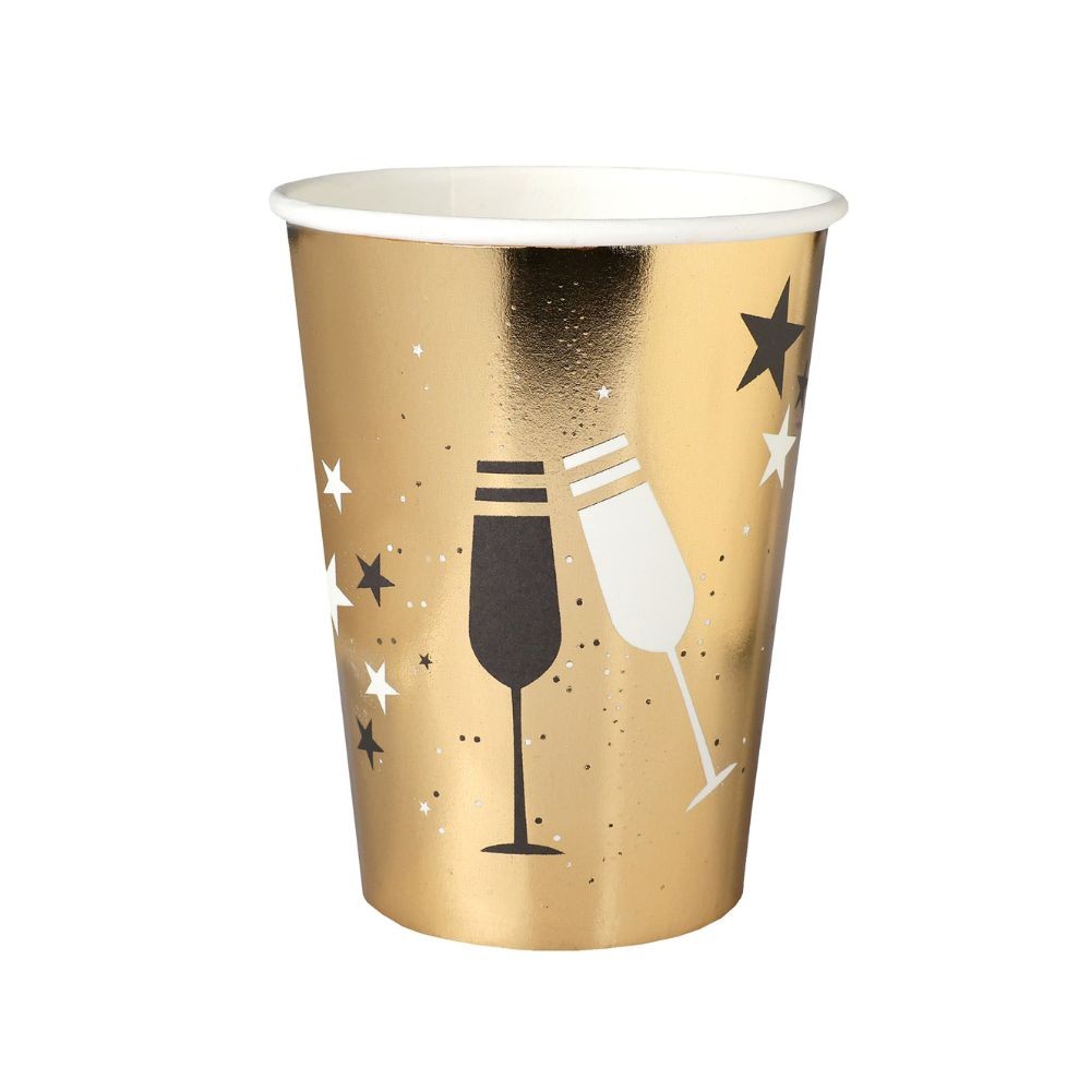 Réf. : ART-085719 Lot de 10 verres en carton imprimé or métal, illustré par des motifs étoiles et flûtes qui s'entrechoquent, pour votre réception de la St Sylvestre. Contenance : 27 cl. Parfait afin d'apporter une note pétillante à vos fêtes de fin d'année.