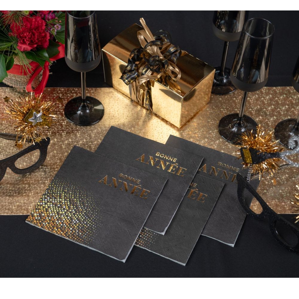 Réf. : ART-085722 Lot de 10 serviettes de table en papier imprimé triple épaisseur, orné d'un motif scintillant et d'une inscription Bonne Année dorée, pour dresser votre table de réception du réveillon. Largeur : 33 cm. Parfaites pour apporter une touche d'élégance et de glamour à vos repas de célébration.