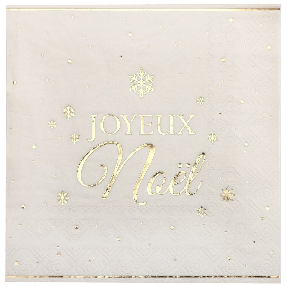 Réf. : ART-084764 Lot de 10 serviettes de couleur ivoire en papier imprimé 3 plis ornées de flocons de neige avec inscription Joyeux Noël de couleur or. Dimensions : 33 x 33 cm. Cet essuie-main est parfait pour un dressage de table de Noël authentique et chaleureux.