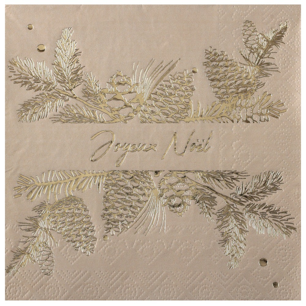 Réf. : ART-084760 Lot de 10 serviettes de couleur crème en papier imprimé 3 plis ornées d'un bouquet nature avec inscription Joyeux Noël de couleur or. Dimensions : 33 x 33 cm. Cet essuie-main est parfait pour un dressage de table de Noël authentique et chaleureux.