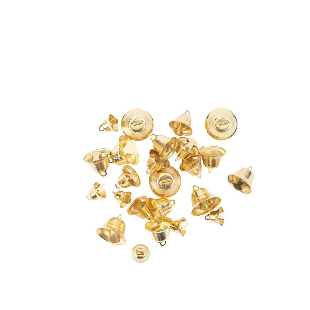 Réf. : ART-085124 Lot de 12 clochettes en métal de couleur or de 1,5 à 2 cm. Parfaites pour les décorations de sapin, couronnes, emballages cadeaux ou simplement dispersés sur votre table. Anneau intégré pour faciliter leur pose, elles accompagneront toutes vos idées créatives à l'occasion des fêtes de fin d'année.