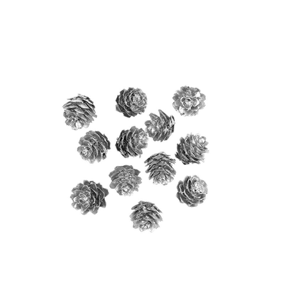 Réf. : ART-085125 Lot de 12 pommes de pin naturelles, subtilement argentées pour un effet brillant, afin de créer un décor forestier hivernal. Dimensions : 2 cm. Vous pouvez les disposer sur vos tables de réception, les utiliser pour décorer une couronne de Noël ou encore customiser un support.