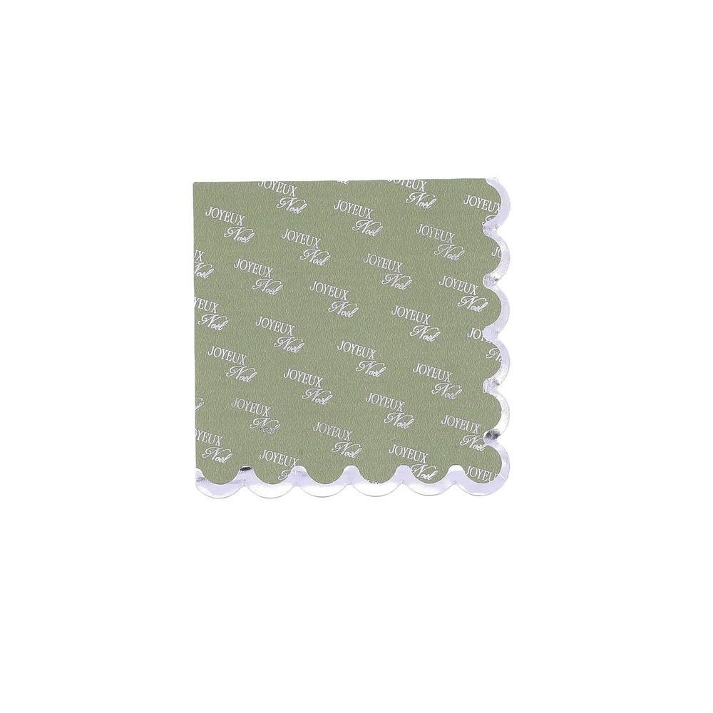 Réf. : ART-085041 Lot de 20 serviettes cocktail de table de couleur vert en papier imprimé 3 plis, à bord doré et partiellement ondulé avec l'inscription Joyeux Noël en argenté. Dimensions : 24 x 24 cm. Parfaites pour préserver une bonne hygiène lors d'un buffet, d'un apéritif ou d'un cocktail, ces serviettes sublimeront votre table pour les festivités de Noël.