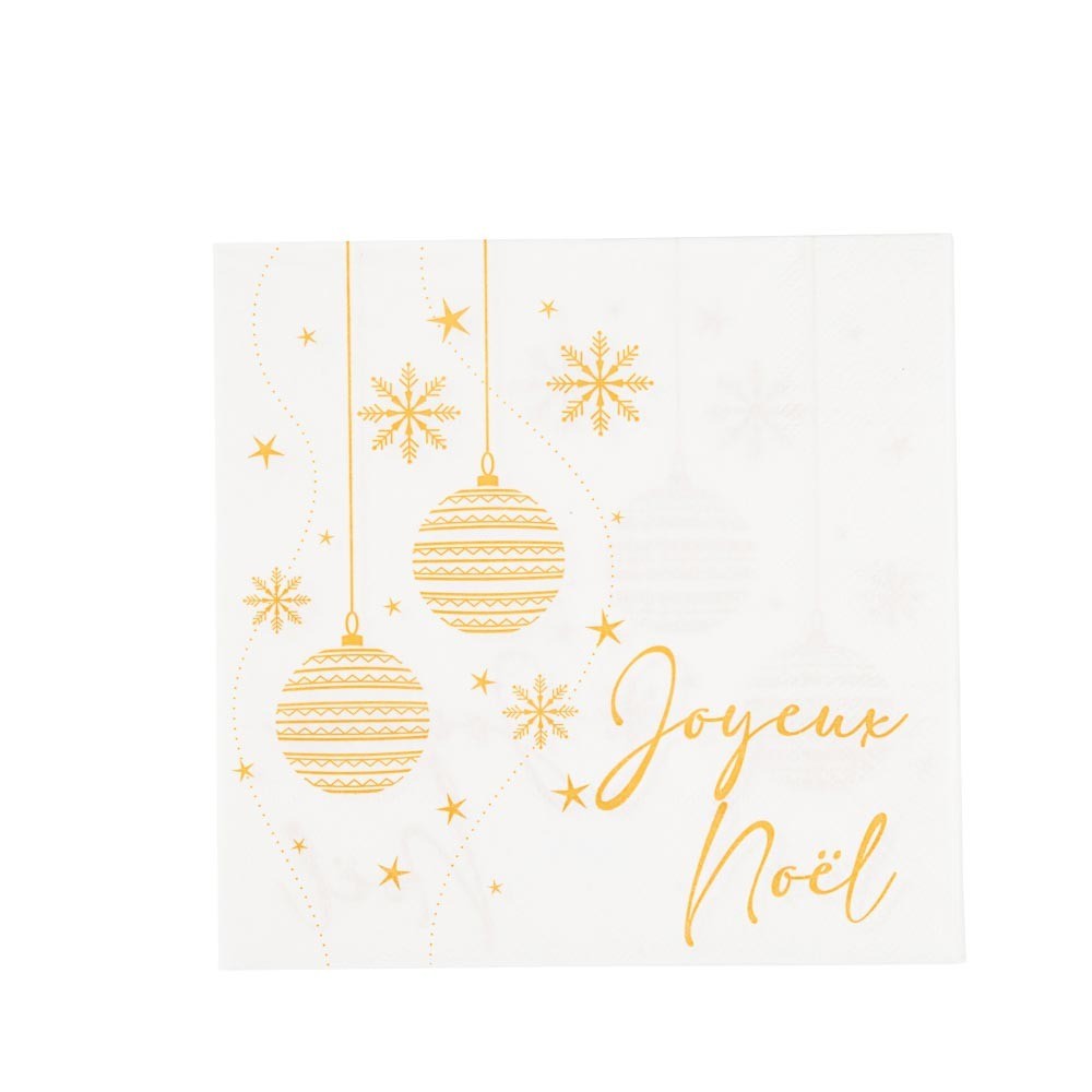 Réf. : ART-085015 Lot de 20 serviettes de table de couleur blanche en papier imprimé 2 plis, illustrées par des boules de Noël suspendues avec des étoiles et l'inscription Joyeux Noël de couleur doré. Dimensions : 32,5 x 32,5 cm. Ce visuel d'essuie-mains est parfait pour mettre des étoiles dans les yeux de vos invités à l'occasion des fêtes de Noël.