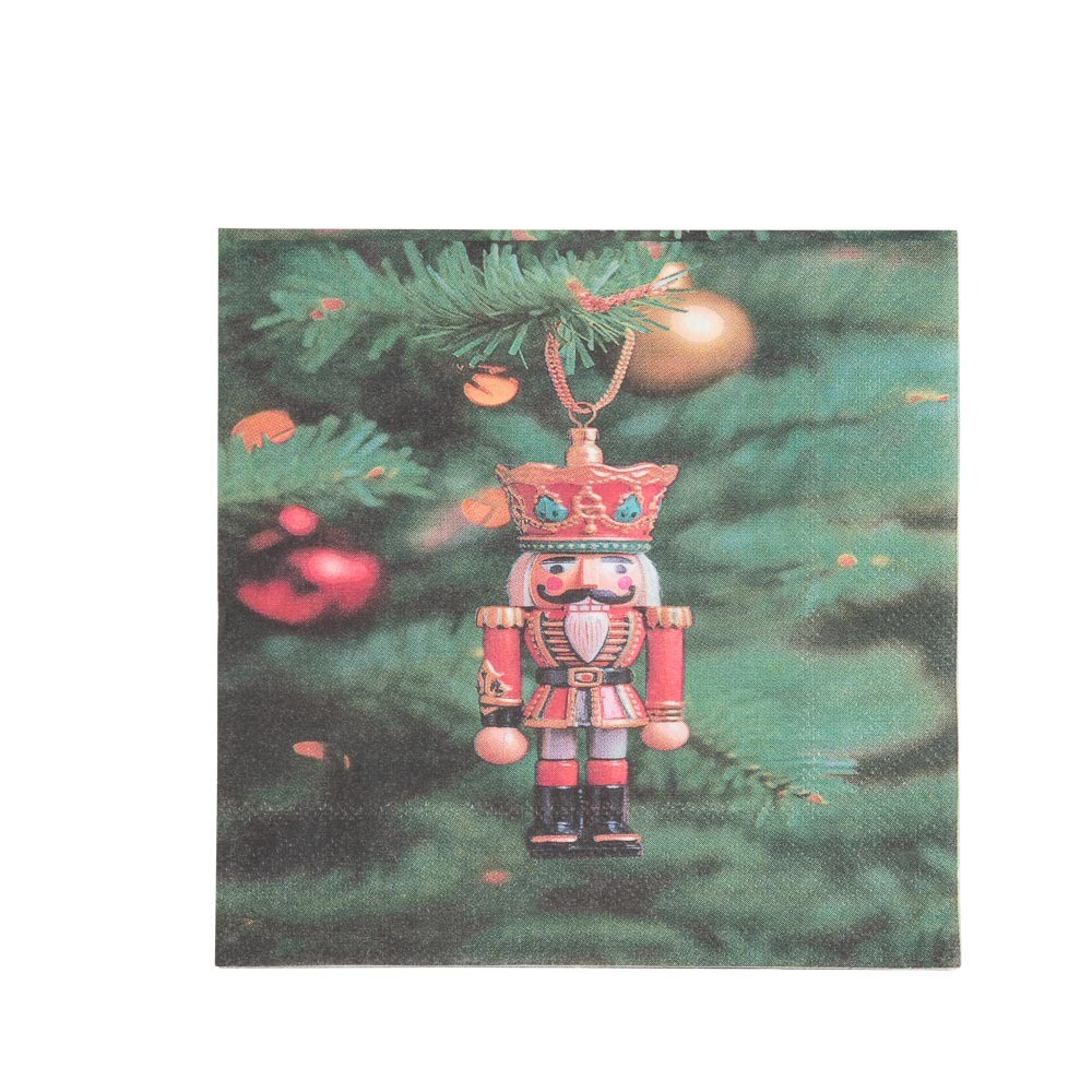 Réf. : ART-085036 Lot de 20 serviettes de table vert en papier imprimé 2 plis, avec motif casse-noisette, suspendu sur un sapin. Dimensions : 32,5 x 32,5 cm. Ce visuel d'essuie-main est idéal pour agrémenter de manière élégante votre décoration de table pour les festivités de Noël.