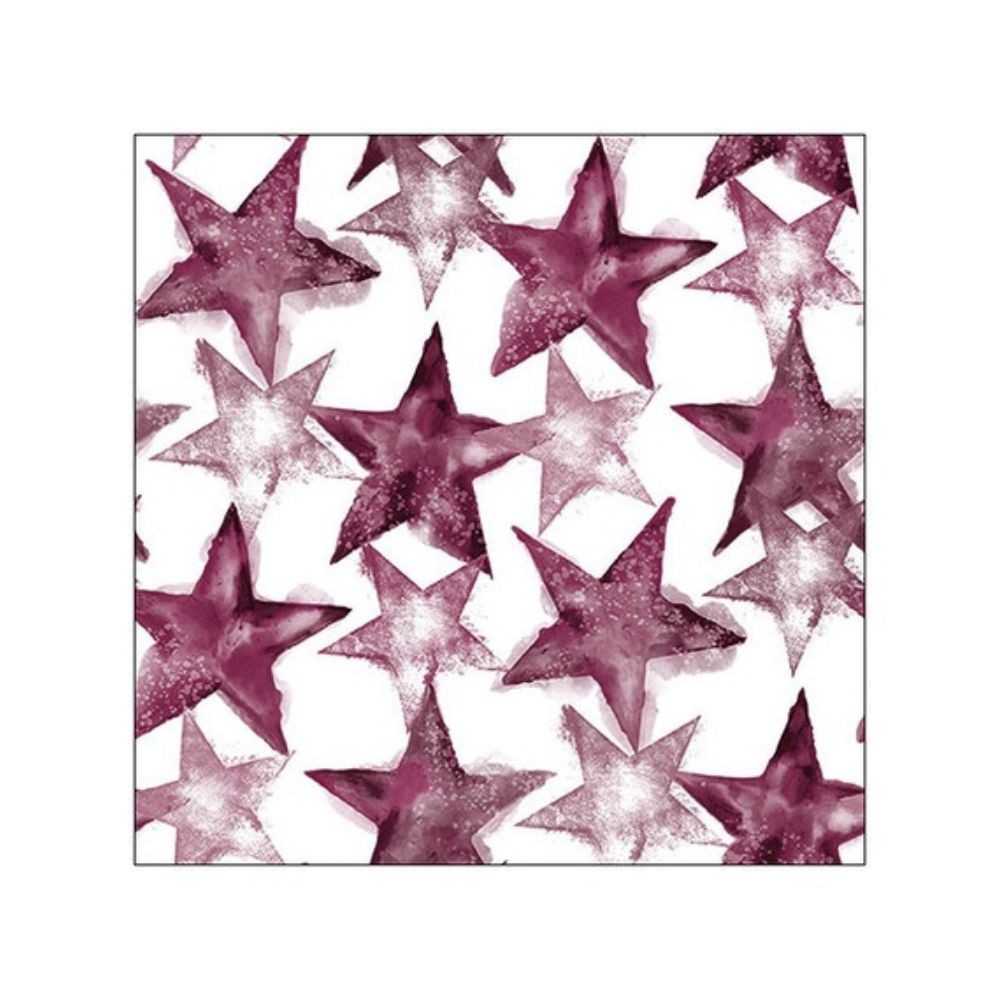 Réf. : ART-085498 Lot de 20 serviettes de table en papier imprimé 3 plis, illustrées de motifs étoile en aquarelle coloris baie, pour dresser une belle table lors des festivités de Noël. Dimensions : 16,5 x 16,5 cm pliées. Le design artistique et poétique, dans des tons profonds et chaleureux, illumine vos tables de fête. Peut aussi servir afin de réaliser de beaux objets de déco en loisirs créatifs.