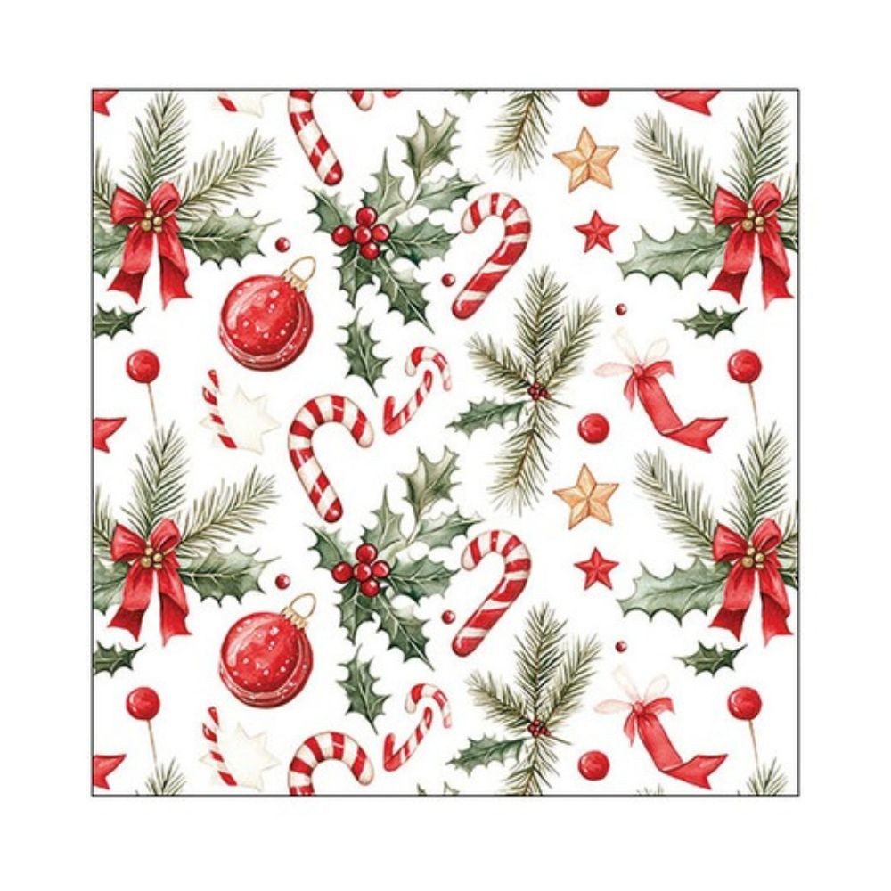 Réf. : ART-085494 Lot de 20 serviettes de table en papier imprimé 3 plis, mariant motifs canne de sucre d'orge et sucette à des branches de sapin et de houx décorées, pour dresser une belle table lors des festivités de Noël. Dimensions : 16,5 x 16,5 cm pliées. Elles apportent charme et authenticité. Peut aussi servir afin de réaliser de beaux objets de déco en loisirs créatifs.