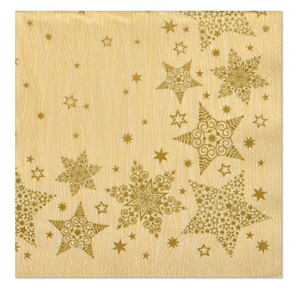 Réf. : ART-085543 Lot de 20 serviettes de table en papier imprimé 3 plis, ornées d'étoiles dorées sur fond cernes de bois, afin de dresser la table de fête. Largeur : 40 cm. Grammage : 54g/m². Elles offrent l'aspect et la tenue du tissu. Elles évoquent la magie des veillées de Noël et transforment vos repas en instants précieux, entre féerie et raffinement. Certifiées FSC, elles sont également respectueuses de l'environnement.