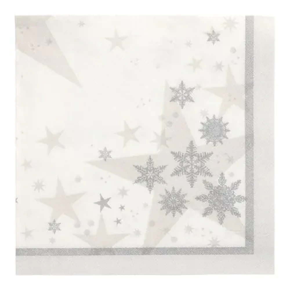 Réf. : ART-085511 Lot de 20 serviettes de table en papier imprimé 3 plis, ornées d'étoiles et de cristaux de glace argentés, afin de dresser la table de fête. Largeur : 40 cm. Grammage : 54g/m². Elles offrent l'aspect et la tenue du tissu. Capturant la pureté d'un ciel d'hiver, elles transforment chaque repas en un instant magique et chaleureux. Certifiées FSC, elles sont également respectueuses de l'environnement.