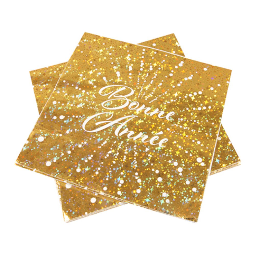 Réf. : ART-085735 Lot de 20 serviettes en papier imprimé, au décor scintillant or avec mention Bonne Année, pour votre repas du réveillon. Largeur : 33 cm. Chic et festives, elles subliment vos tables de réveillon avec élégance et éclat. Parfaites pour un Nouvel An étincelant et raffiné.