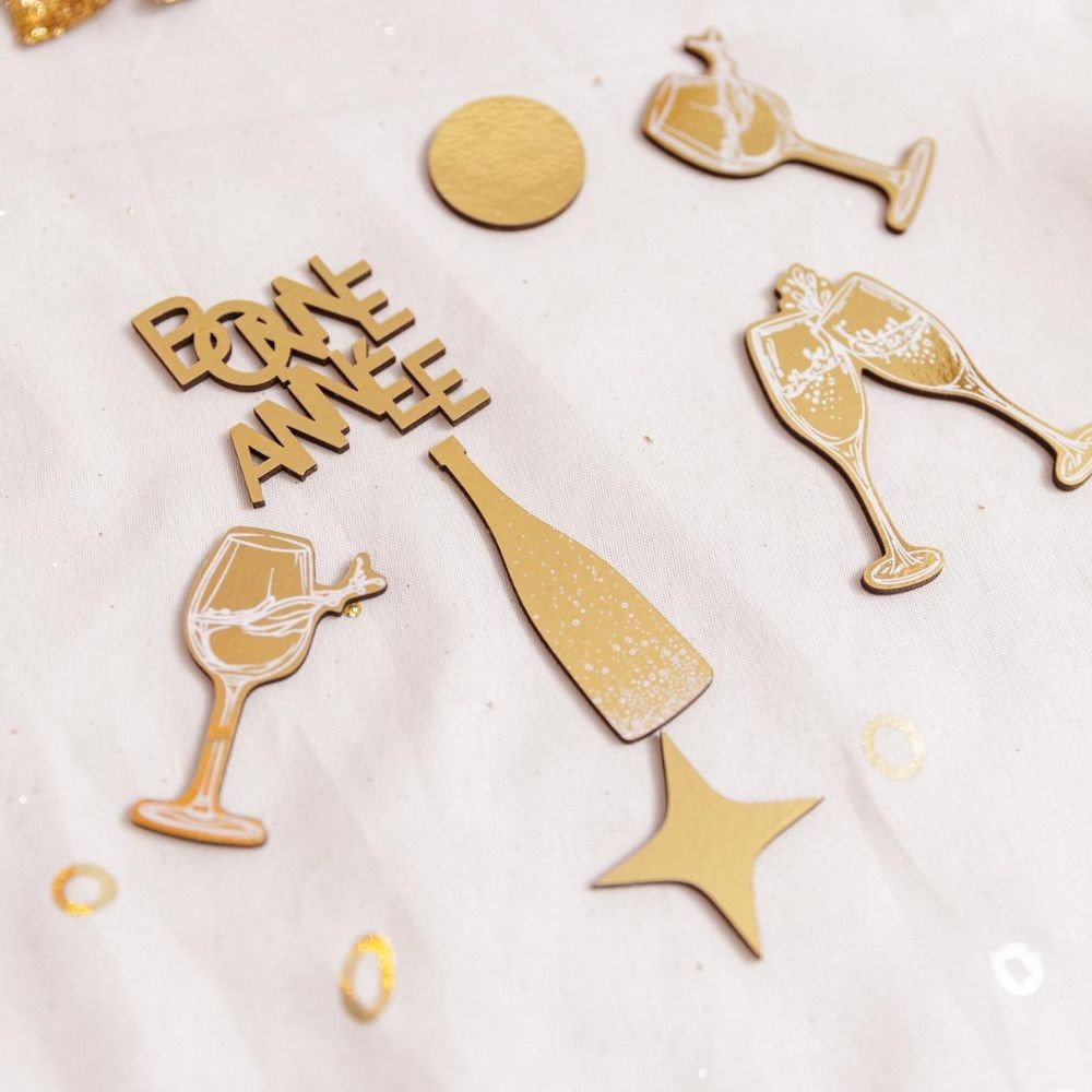 Réf. : ART-085762 Lot de 8 confettis en bois dorés pour sublimer votre table de réception de la Saint Sylvestre. Dimensions : 2,5 à 6 cm. Ces petits éléments décoratifs en forme de verres à champagne, bouteilles, étoiles et inscriptions Bonne Année ajoutent une touche d'éclat et de raffinement à votre décoration. Leur finition or métallisé capte la lumière et crée une ambiance élégante et festive, idéale pour célébrer le passage à la nouvelle année dans une atmosphère chic et pétillante.