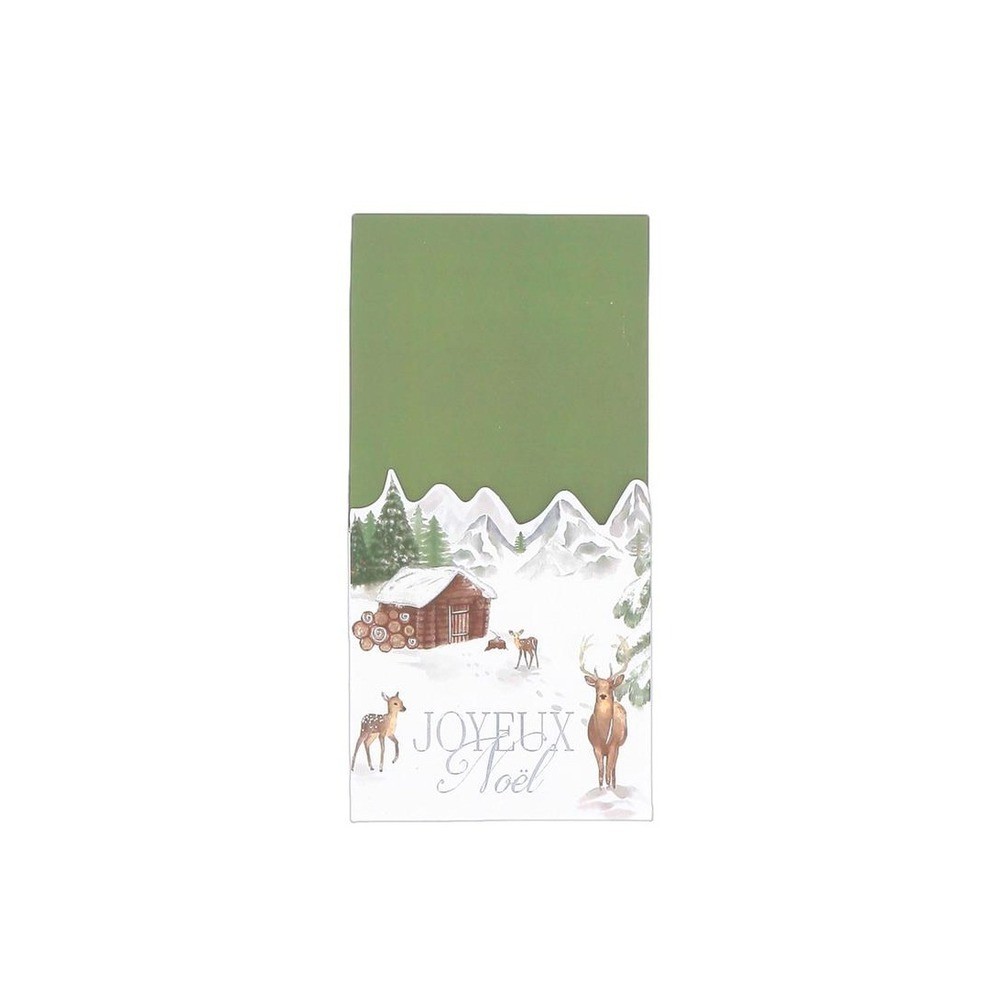 Réf. : ART-085110 Lot de 8 porte-couverts en papier de 10 cm x 20 cm de couleur vert et blanc représentant un paysage enneigé et l'inscription Joyeux Noël en argent. Apportez une note chic et décalée à votre décoration de table à l'occasion des fêtes de Noël avec ces porte-couverts originaux.