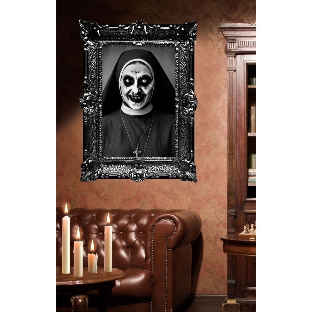 Réf. : ART-084237 Cadre baroque vintage autocollant, affichant une bonne s?"ur revenante possédée, afin de transformer votre intérieur en couvent maudit. Dimensions : 58 x 45 cm. Son sourire démoniaque et son regard perçant glaceront le sang de vos visiteurs. Une déco aussi sacrément sinistre qu'inoubliable pour un Halloween sous haute tension spirituelle !