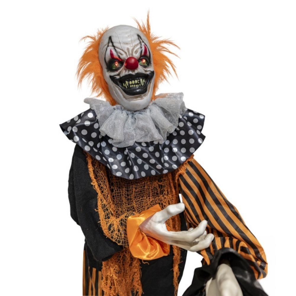 Réf. : ART-084160 Automate mettant en scène un clown maléfique, portant un ballon orange, pour vos festivités d'Halloween. Hauteur : 1,65 m. Il porte un costume à rayures noires et orange avec col à volants. Ses principales caractéristiques sont : yeux rouges led, les bras et la tête bougent d'avant en arrière, 5 sons effrayants et activé par le son et le mouvement. Nécessite 3 piles AA pour fonctionner. Installation facile et rapide.