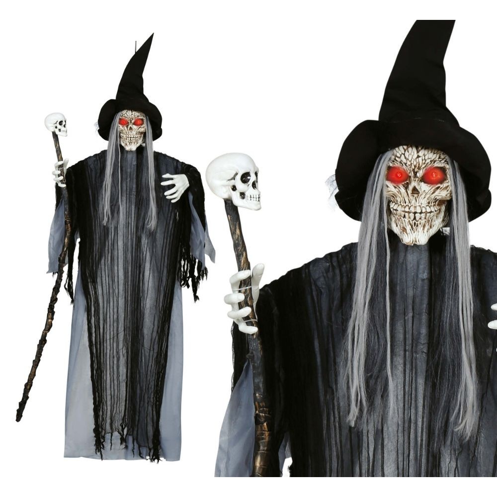 Réf. : ART-084255 Automate à suspendre mettant en scène une sorcière ténébreuse animé, avec bâton squelette, pour ensorceler vos invités à Halloween. Hauteur : 180 cm. Fonctionnement à piles AA (incluses). Ses principales caractéristiques sont : yeux lumineux, mouvements et émission de sons effrayants. À la moindre activité, il s'active pour un effet de surprise et de frayeur. Parfait afin de faire trembler d'effroi les passants.