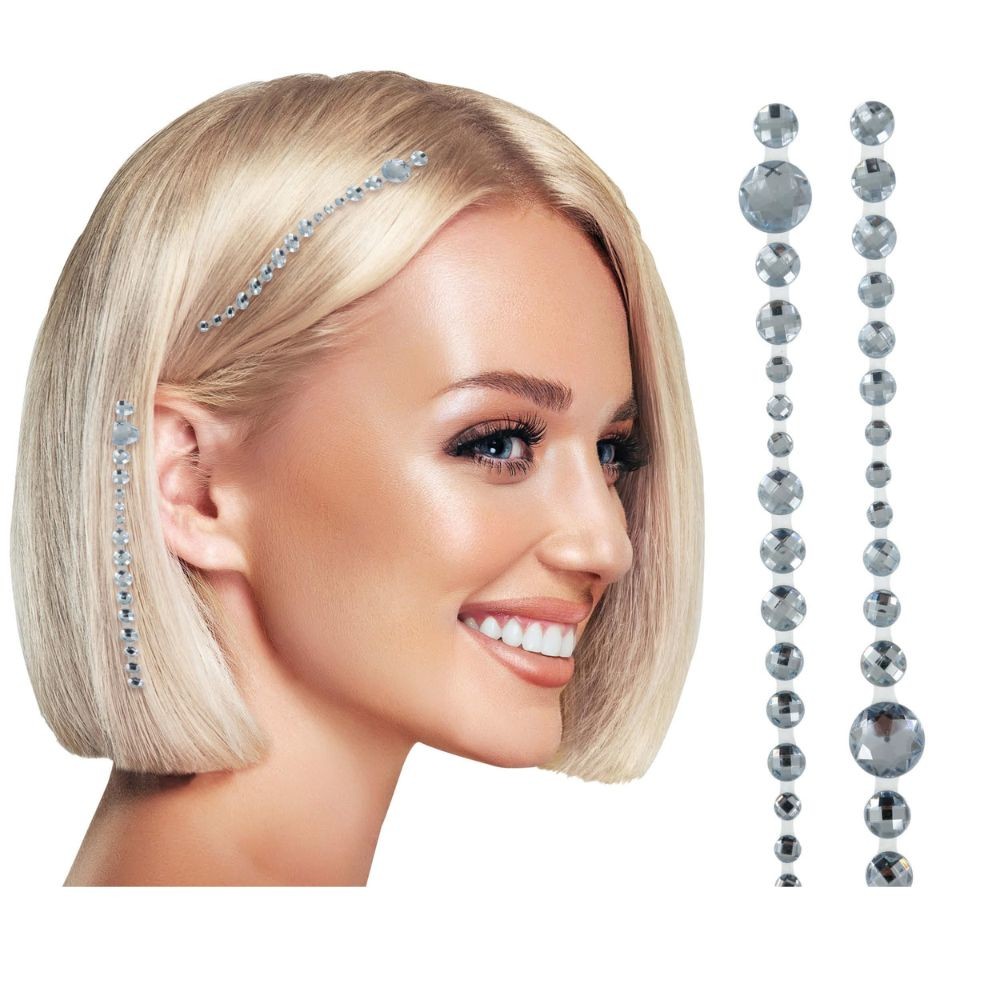 Réf. : ART-084146 Bijoux autocollants pour cheveux en strass argentés, effet mèche scintillante. Faciles à poser, ces décorations subliment instantanément votre coiffure pour une soirée, un festival ou un look glamour de fête. Un accessoire tendance et réutilisable pour briller de mille feux.