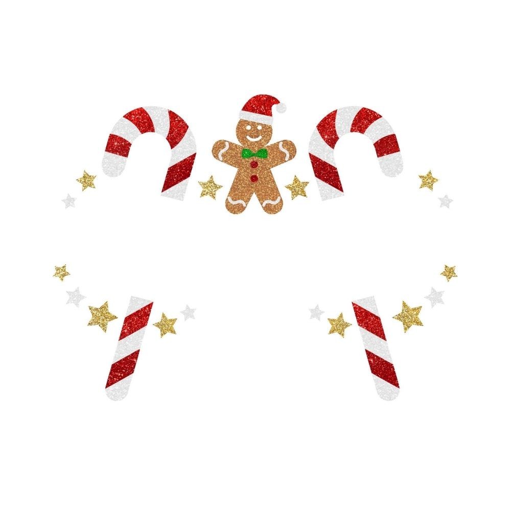 Réf. : ART-085615 Bijoux de peau adhésifs sur le thème gourmandise de Noël pour faire craquer votre entourage. Composés de cannes à sucre, d'étoiles dorées et d'un petit bonhomme pain d'épices, ils illuminent le visage d'une touche sucrée et festive. Faciles à appliquer, confortables et réutilisables, ils sont parfaits pour les soirées de fêtes ou les maquillages de Noël créatifs.