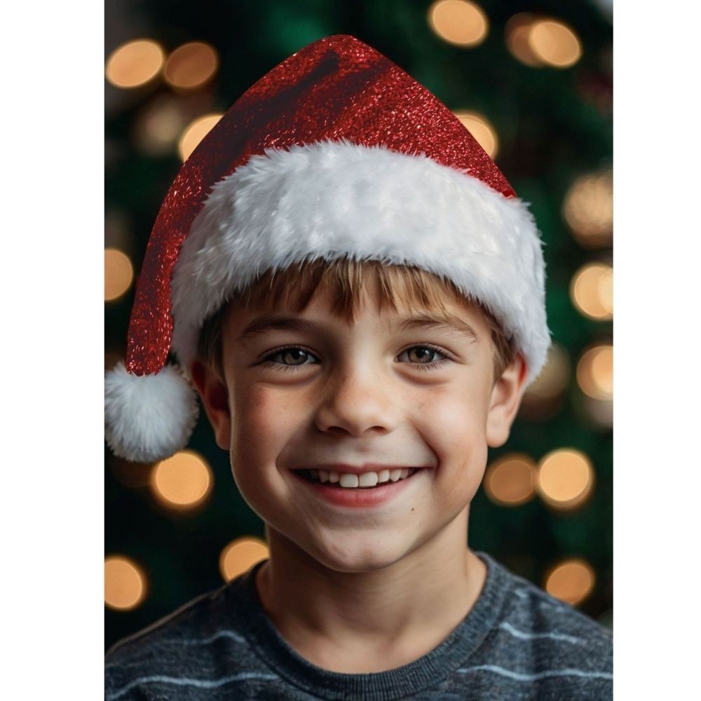 Réf. : ART-085627 Bonnet de Père Noël scintillant premium pour enfant, en tissu rouge pailleté éclatant et bordé d'une douce fourrure blanche. Avec son pompon moelleux et son effet lumineux, il apporte instantanément une touche magique aux fêtes de fin d'année. Idéal pour compléter une tenue festive et plonger les plus petits dans la féérie de Noël.