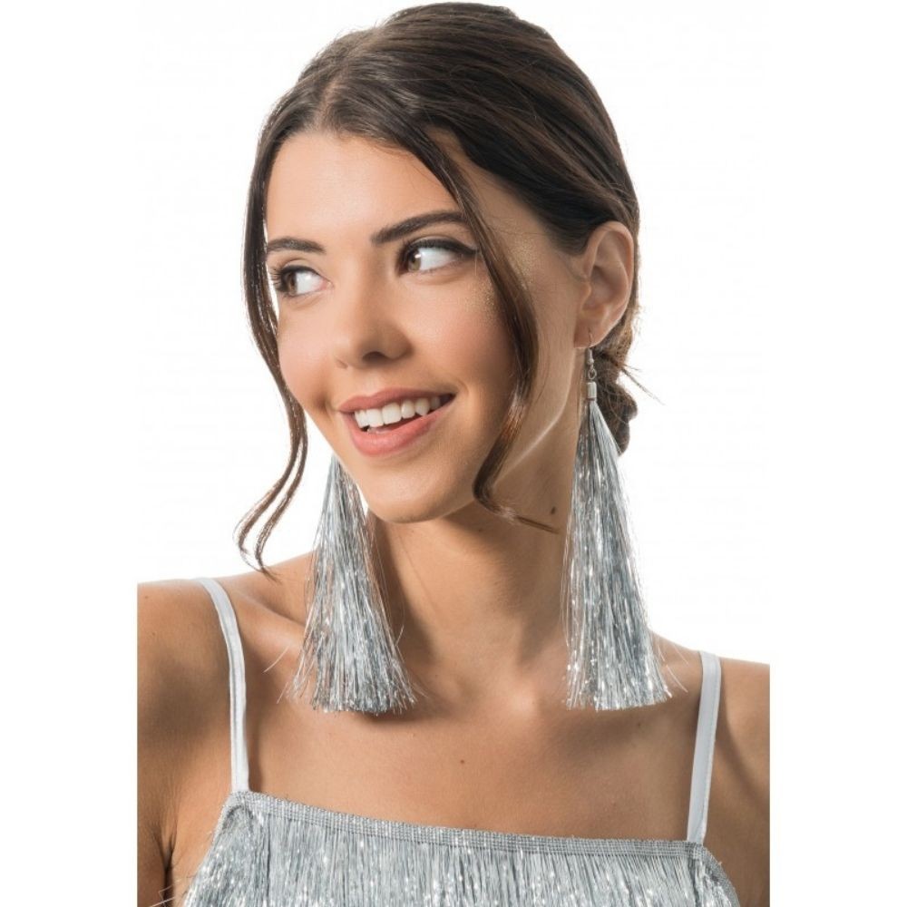 Réf. : ART-084122 Boucles d'oreilles à franges en fil métal argent scintillant pour apporter une touche glamour et festive à votre look. Longueur : 17 cm. Idéales pour les soirées, festivals ou déguisements, elles captent la lumière à chaque mouvement pour un effet sensationnel. L'accessoire parfait pour affirmer votre style avec audace !