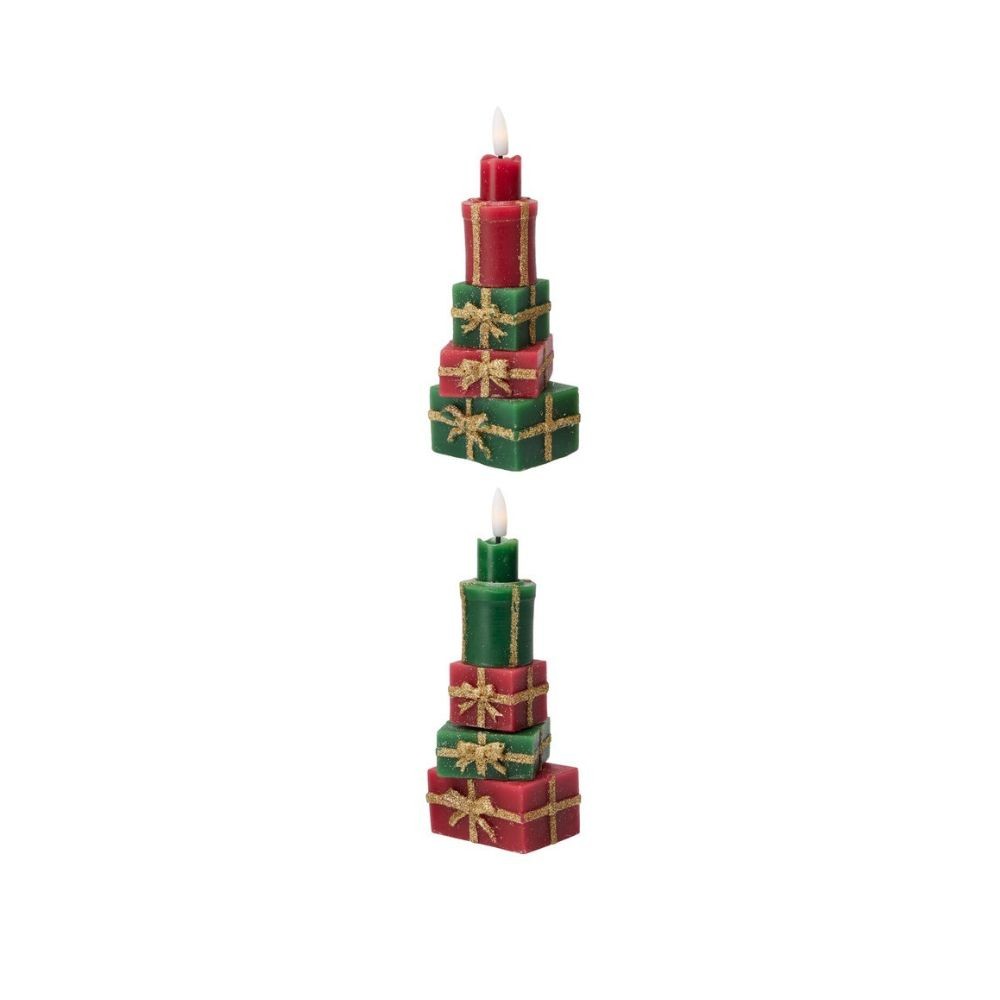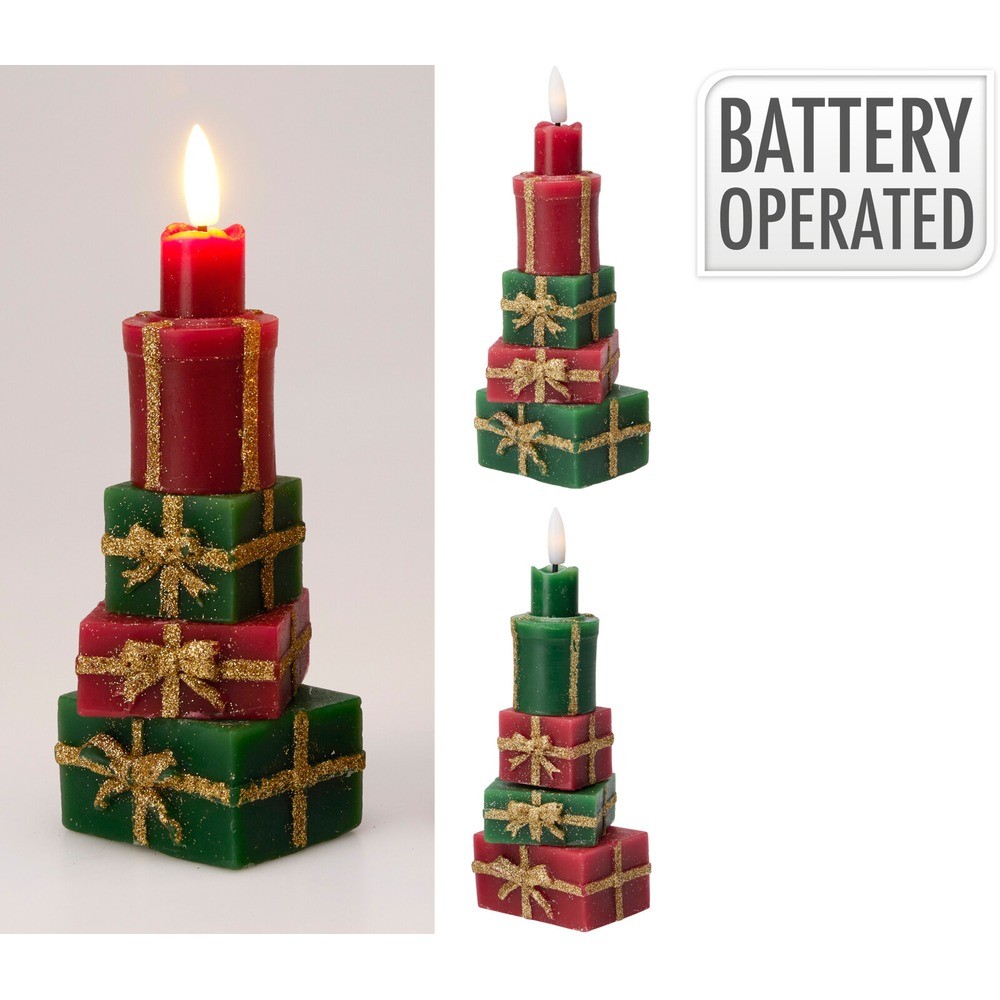 Réf. : ART-085293 La bougie LED empilée en forme de cadeaux enrubannés illumine vos fêtes d'un éclat joyeux et féerique. Dimensions : 18 x 6 cm. Vendu à l'unité. Déclinée en deux versions colorées rouge et vert, elle associe la douceur de la paraffine à une flamme LED vacillante. Elle apporte une touche ludique et magique à votre décoration de Noël sans flamme ni contrainte. Fonctionne avec 2 piles AA (non incluses).