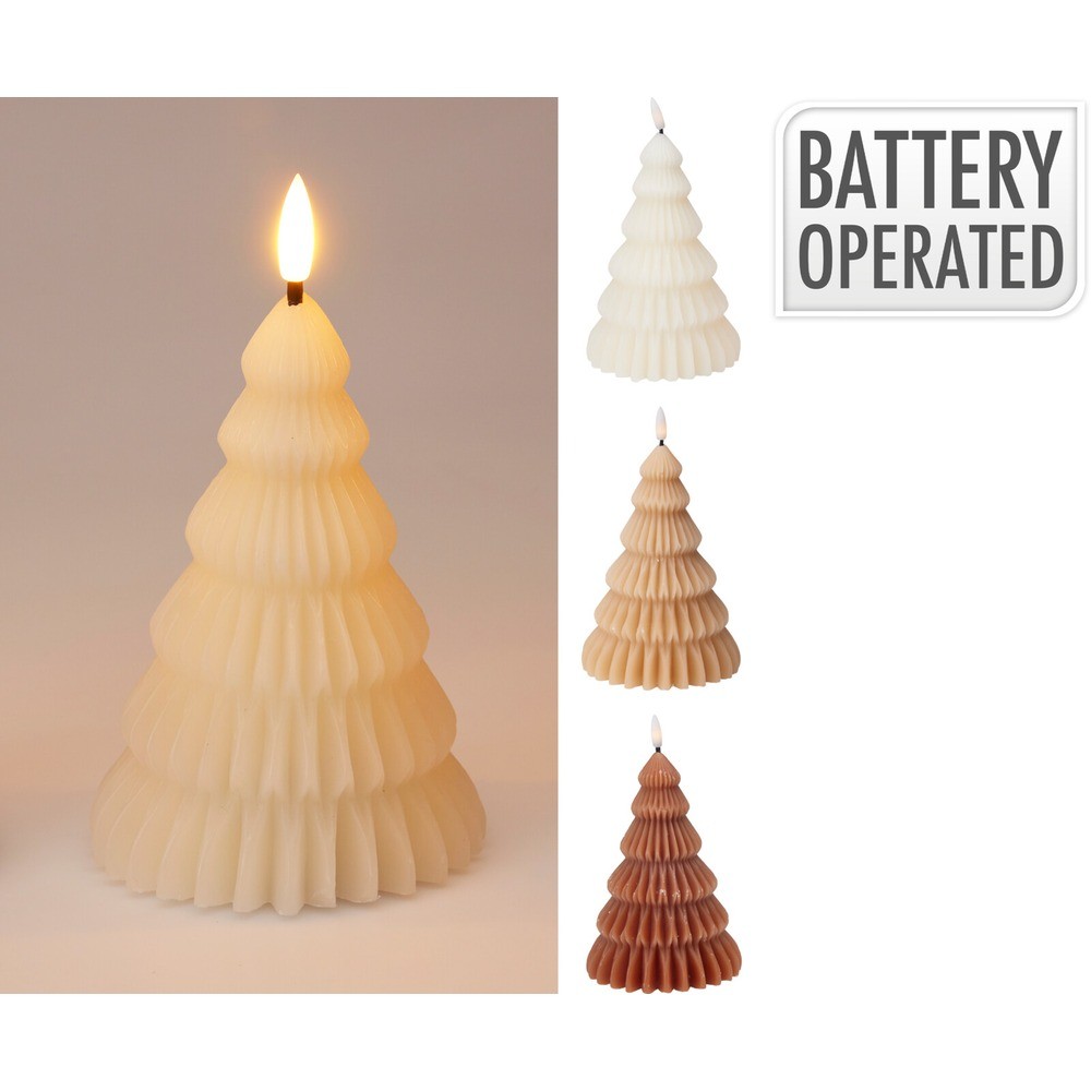 Réf. : ART-085305 La bougie LED sapin réinvente l'esprit de Noël avec poésie et douceur. Dimensions : 11 x 18 cm. Vendu à l'unité. 3 coloris existent (marron, beige et ivoire), envoi aléatoire en fonction du stock disponible. Son design en paraffine sculptée évoque les branches enneigées. Idéale pour créer une ambiance féerique sans flamme ni contrainte. Fonctionne avec 2 piles AA (non incluses).