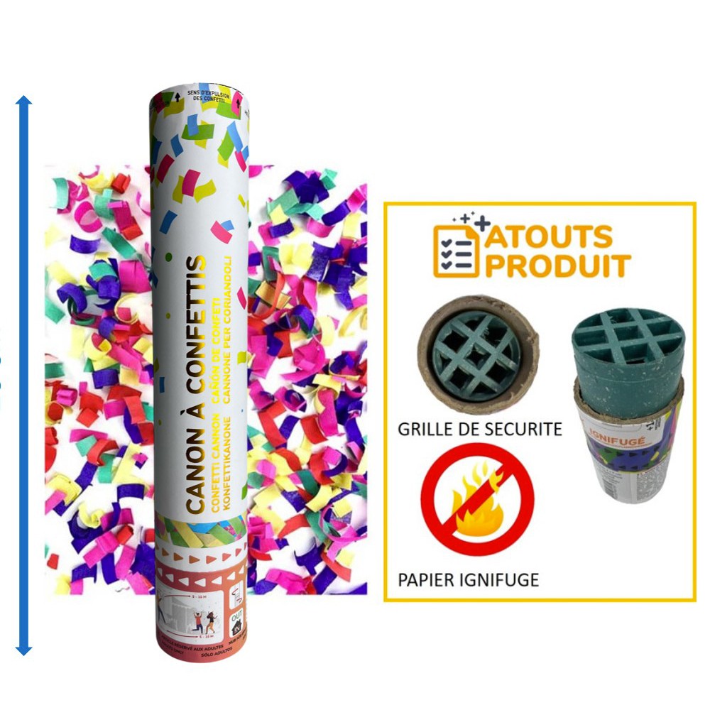 Réf. : ART-083653 Canon à confettis en papier rectangle multicolore pour mettre l'ambiance lors de vos festivités. Hauteur de projection : minium 4-6 m (selon l'angle d'inclinaison et les conditions de vent). Les confettis sont ignifugés pour vous garantir une sécurité optimale. Biodégradables, ils sont parfaits pour une célébration écologique. Vous l'apprécierez notamment pour marquer un évènement particulier : passage à la nouvelle année, arrivée du gâteau de mariage ou d'anniversaire ou encore la célébration d'une victoire sportive.