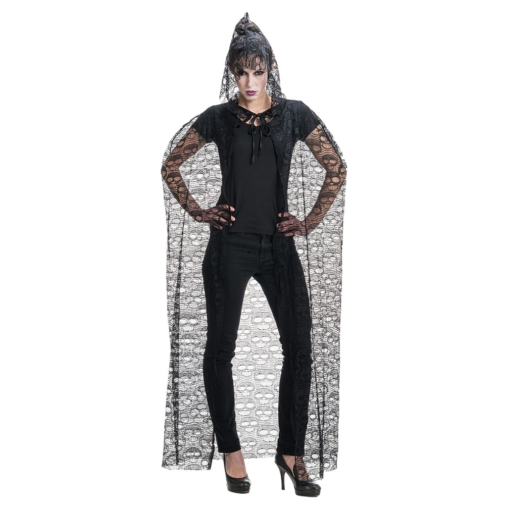 CAPE CAPUCHE DENTELLE TÊTE DE MORT 145CM ADULTE