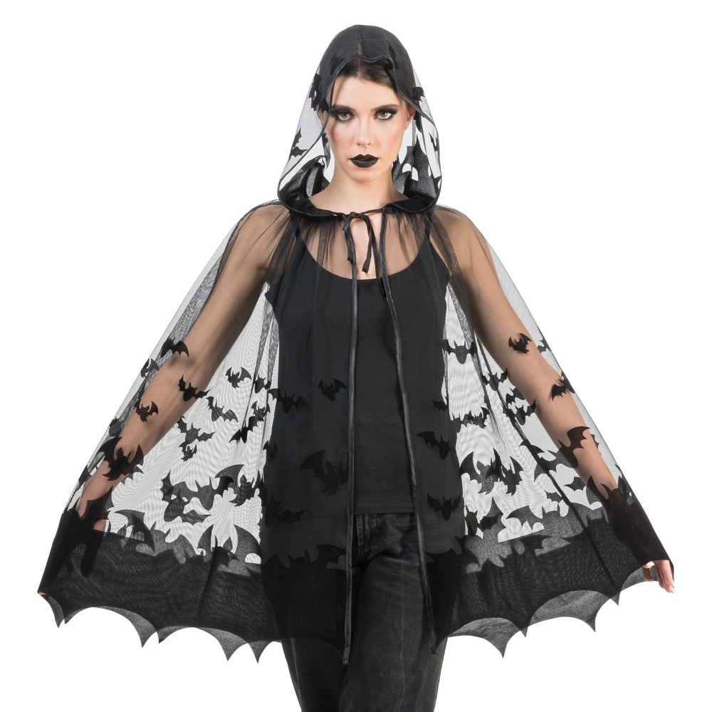 Réf. : ART-083966 Cape à capuche adulte, en tulle noir ornée de motifs chauves-souris, pour compléter votre tenue d'Halloween. Longueur : 78 cm. Elle possède un bord en forme d'ailes du petit mammifère nocturne. Légère et fluide, elle convient aussi bien pour les soirées costumées que pour une touche gothique chic lors d'un carnaval ou d'un spectacle. Facile à enfiler avec fermeture à nouer.