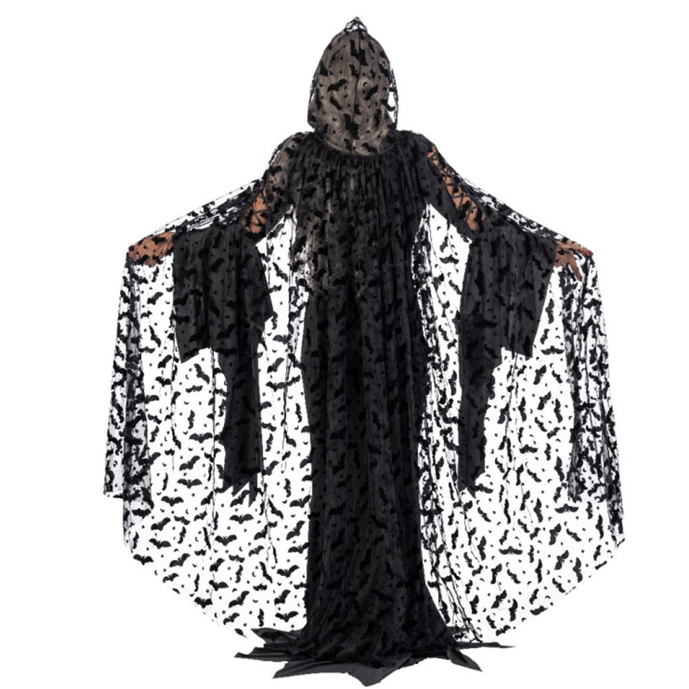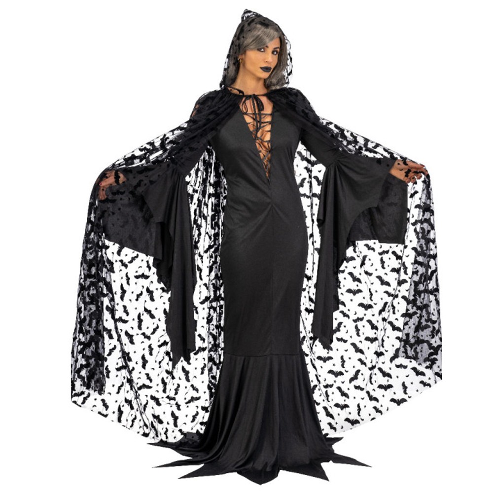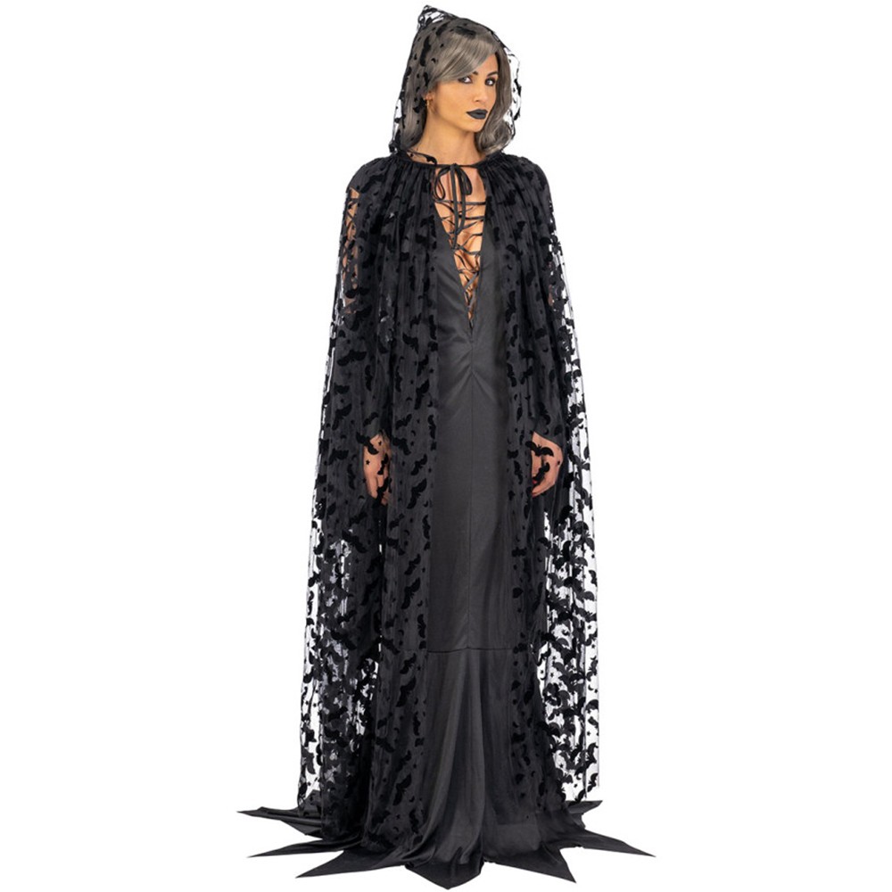 Réf. : ART-083909 Cape longue noire à capuche pour femme, en voile transparent orné de motifs chauves-souris noires, pour apporter une touche mystérieuse et élégante à n'importe quelle tenue sombre et ensorcelante. Longueur : 140 cm. Parfait pour compléter un déguisement de sorcière, vampire ou enchanteresse lors d'Halloween.