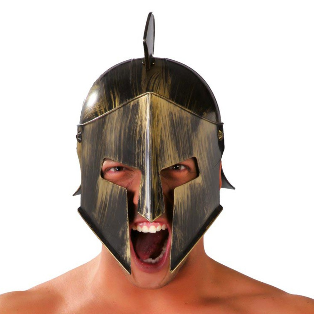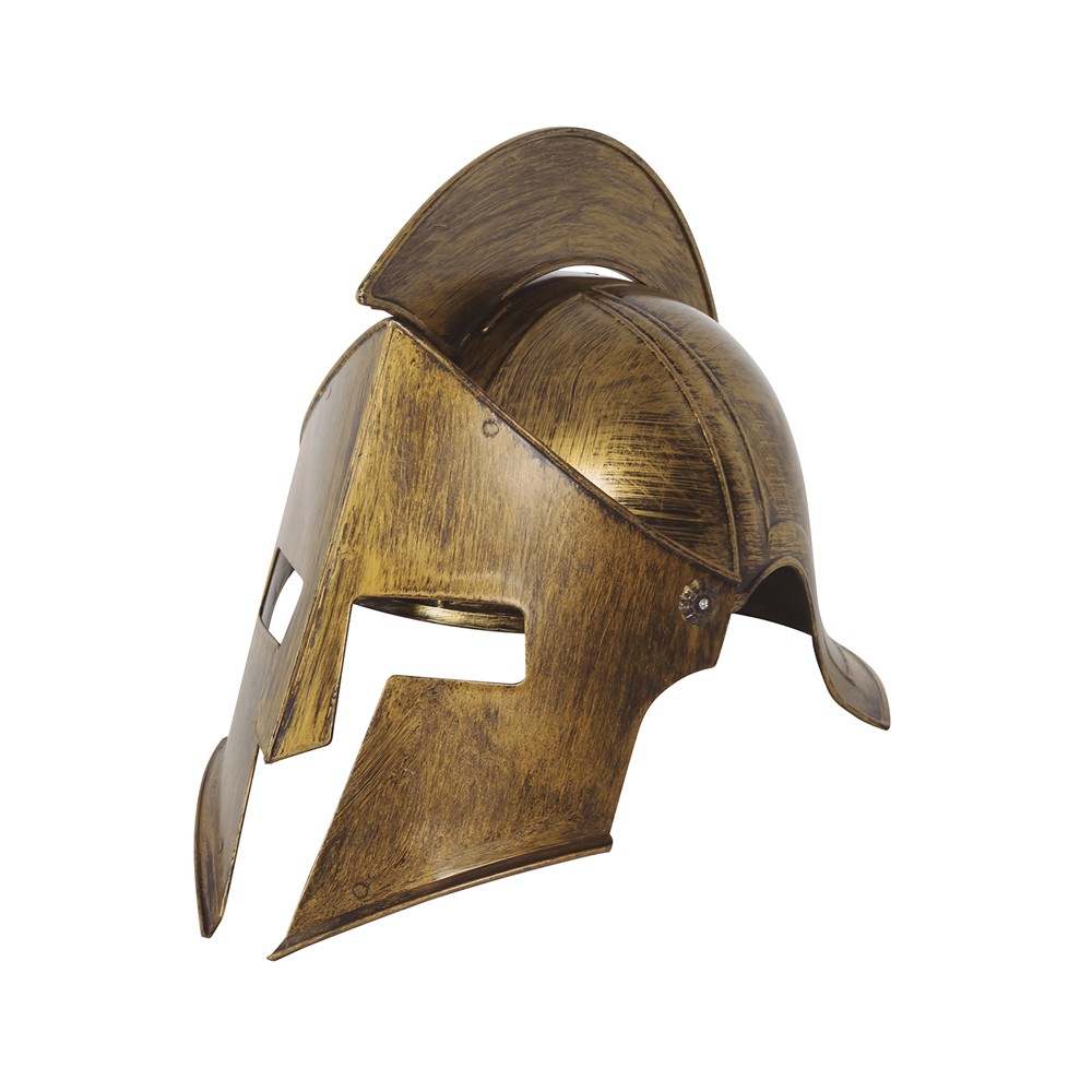 Réf. : ART-083675 Casque corinthien adulte en pvc or effet vieilli, avec visière pivotante et crête, pour compléter votre déguisement. Parfait pour jouer un guerrier spartiate lors d'une fête à thème Péplum ou Antiquité.