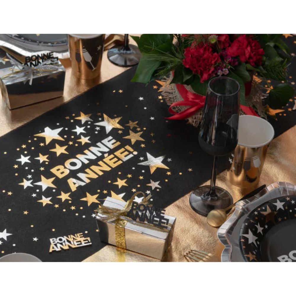 Réf. : ART-085767 Chemin de table en tissu non tissé polyester noir, avec inscription Bonne Année au milieu de motifs étoilés or métal, pour votre réception de la St Sylvestre. Dimensions : 28 cm x 3 m. Parfait pour apporter une touche de glamour à votre décoration de fête.