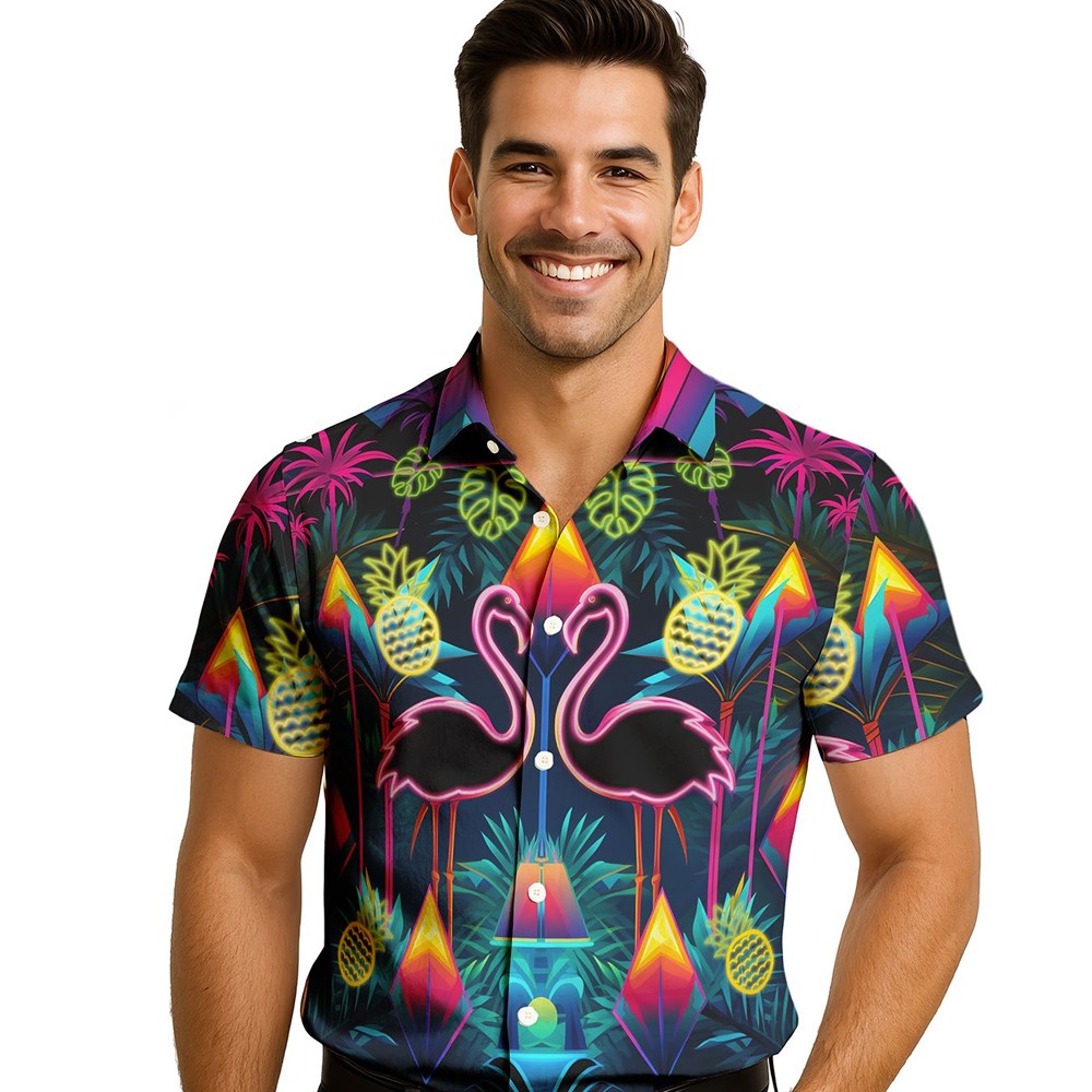 Réf. : ART-083945 Chemise à manches courtes pour adulte, avec motifs flamants roses en style néon, palmiers flashy et motifs tropicaux sur fond noir, pour faire sensation. Parfait pour vos soirées estivales, elle combine confort et ambiance festive. Parfaite pour briller en soirée, à la plage ou en festival !