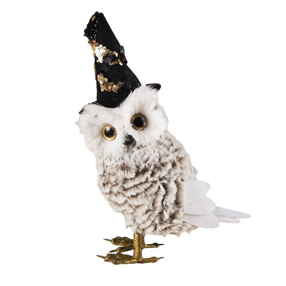 Réf. : ART-083852 Chouette blanche décorative coiffée d'un chapeau de sorcière orné de sequins dorés, pour créer une ambiance féérique. Hauteur : 30 cm. Les matériaux résistants garantissent une durabilité optimale. Parfait pour la nuit d'Halloween ou une fête à thème, le rapace nocturne ajoute une touche mystérieuse à votre espace de réception.
