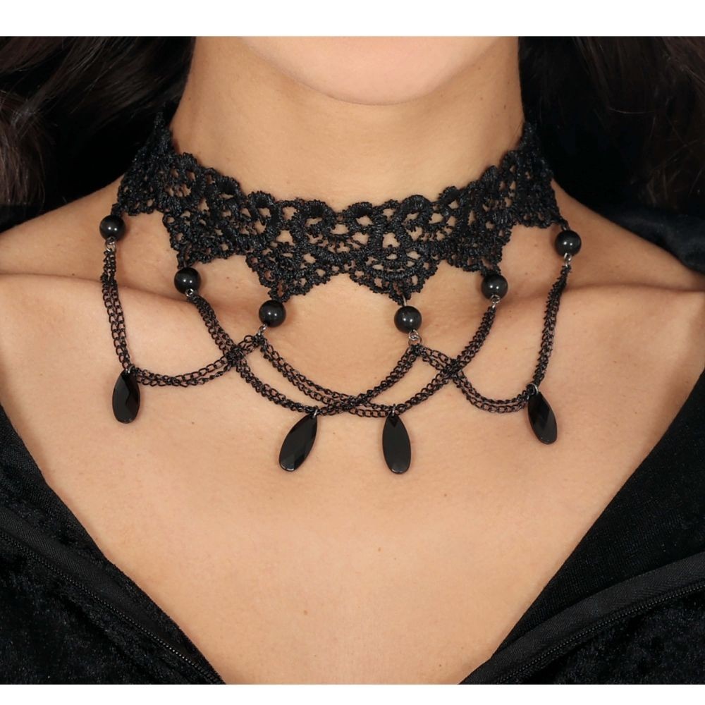 Réf. : ART-084309 Collier ras-de-cou en dentelle noire, rehaussé de chaînes délicates et de gouttes noires étincelantes, afin d'évoquer les élégances sombres de la nuit. Idéal pour parfaire un costume de vampire ou de duchesse des ténèbres, il apporte une touche dramatique et raffinée à toutes vos soirées ensorcelées.