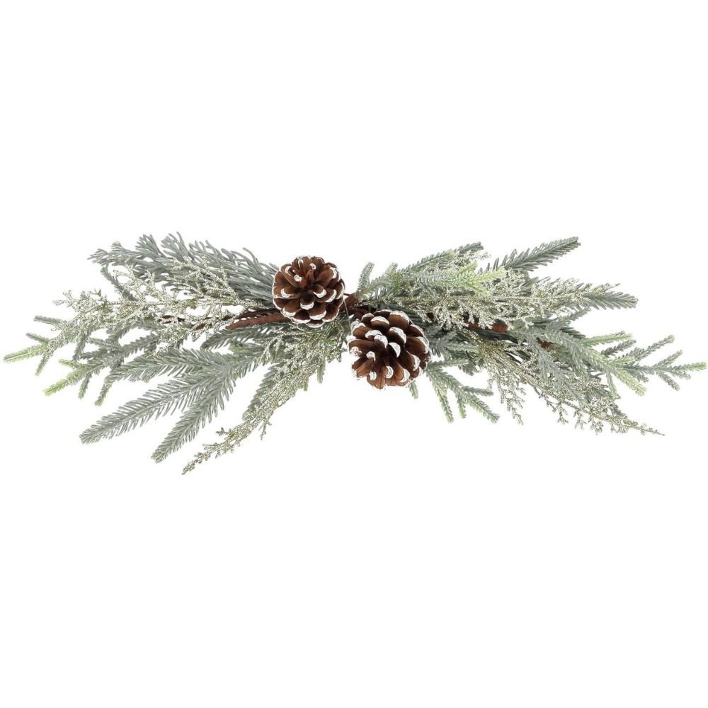 Réf. : ART-085550 Composition de sapin givré artificiel, ornée de branches enneigées, de paillettes champagne et de pommes de pin naturelles, à placer en centre de table pour une décoration féérique lors des festivités de Noël. Longueur : 40 cm. Elle évoque la magie des paysages hivernaux.