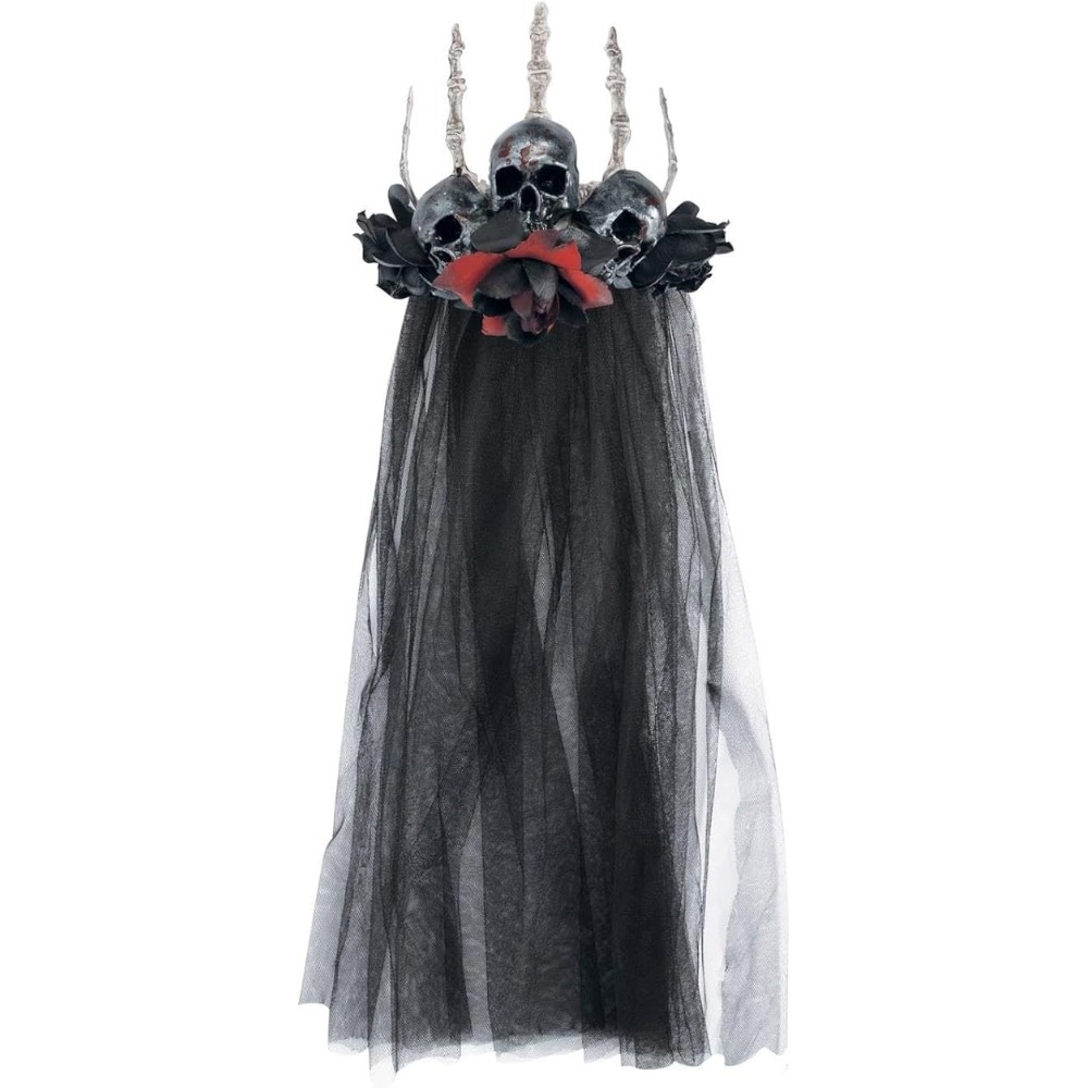 Réf. : ART-083859 Couronne fleurie sombre pour accessoiriser un costume de mariée gothique ou de reine des ténèbres. Ornée de fleurs factices noires, de pics argentés et d'un crâne effrayant, cette coiffe dramatique avec voile noir ajoute une touche macabre et élégante à votre déguisement. Parfaite pour Halloween ou une soirée à thème. Confortable et facile à porter.