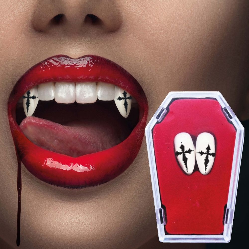 Réf. : ART-084322 Canines réutilisables pour adulte, décorés de croix gothiques, afin d'accessoiriser un déguisement de vampire. L'application des dents est facile grâce aux pastilles thermoplastiques incluses, à chauffer dans de l'eau chaude. Entre séduction et damnation, il apporte du mordant à soirées Halloween ou univers dark chic. Confortable à porter, il sera difficile de ne pas succomber à l'élégance obscure.