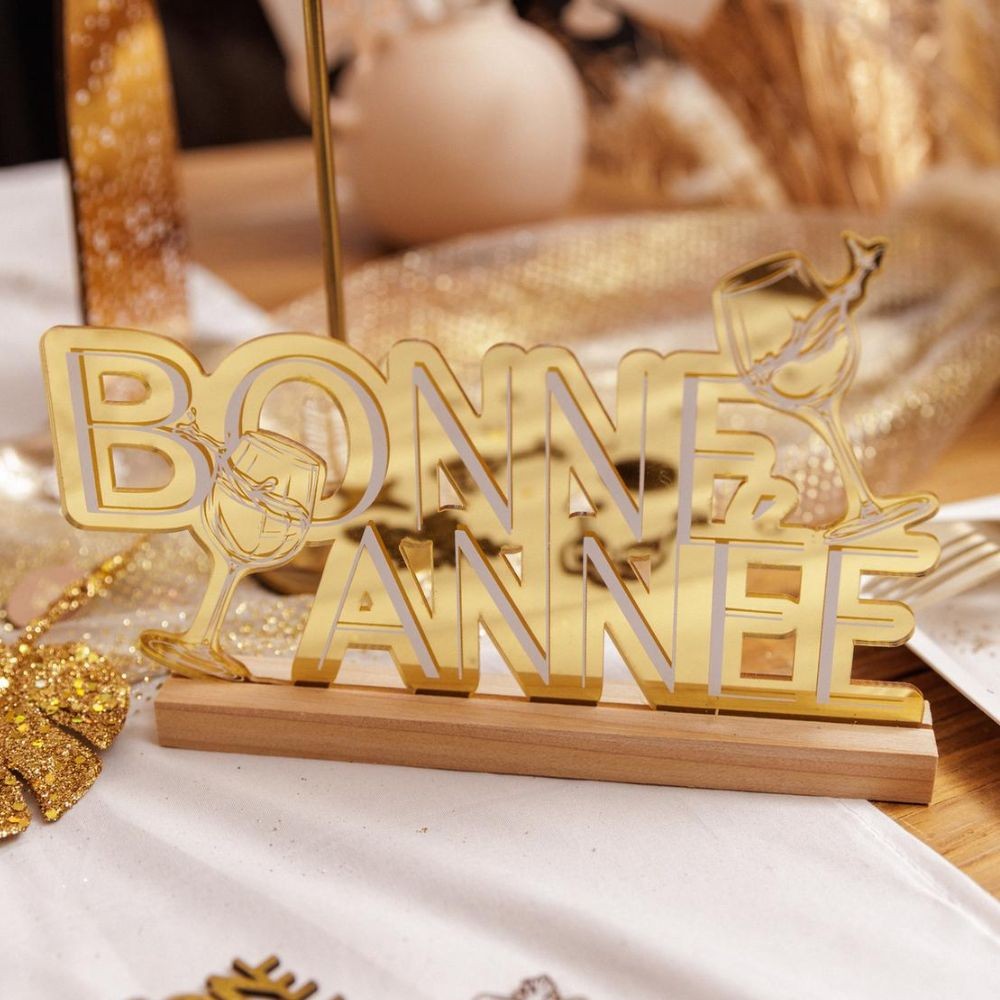 Réf. : ART-085771 Décoration en bois et plexiglas Bonne Année or pour sublimer votre table de fête. Dimensions : 22 x 14 x 2,5 cm. Élégante et raffinée, elle associe une base en bois naturel à une inscription dorée brillante, ornée de verres à champagne symbolisant la célébration et la convivialité. Idéale comme centre de table ou élément décoratif, elle incarne parfaitement l'esprit festif et pétillant du Nouvel An.