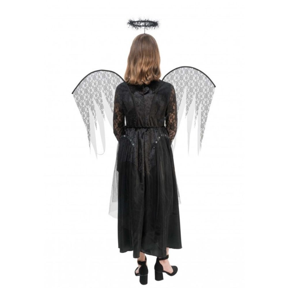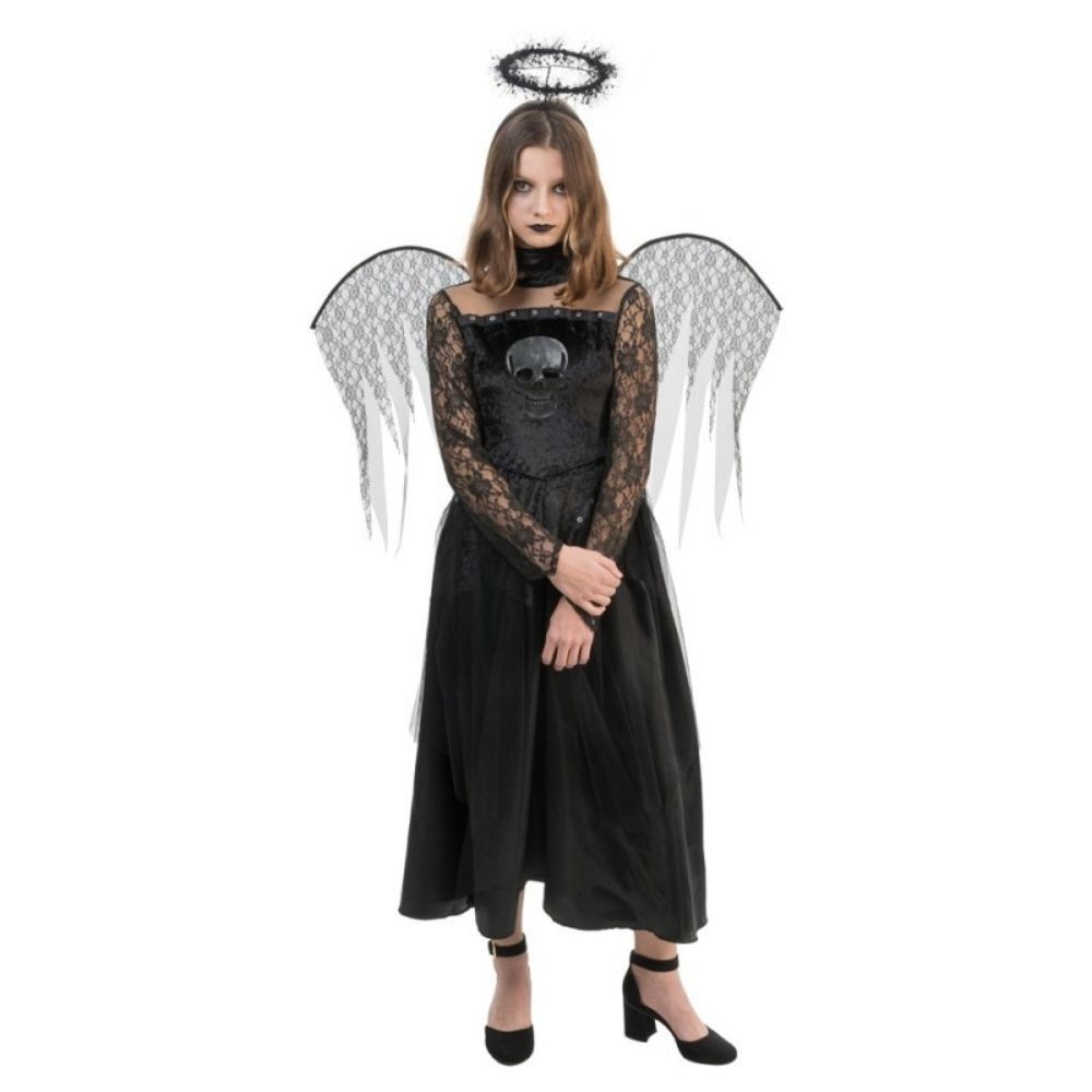 Déguisement d'ange déchu pour fille comprenant la robe, les ailes et le serre-tête auréole. Sombre et céleste à la fois, incarnez l'élégance ténébreuse avec ce costume d'Ange Noir. Robe longue gothique ornée de dentelle délicate, motif crâne subtil sur le buste, ailes noires diaphanes et auréole ténébreuse : un contraste envoûtant entre grâce et obscurité pour une Halloween angéliquement macabre.
