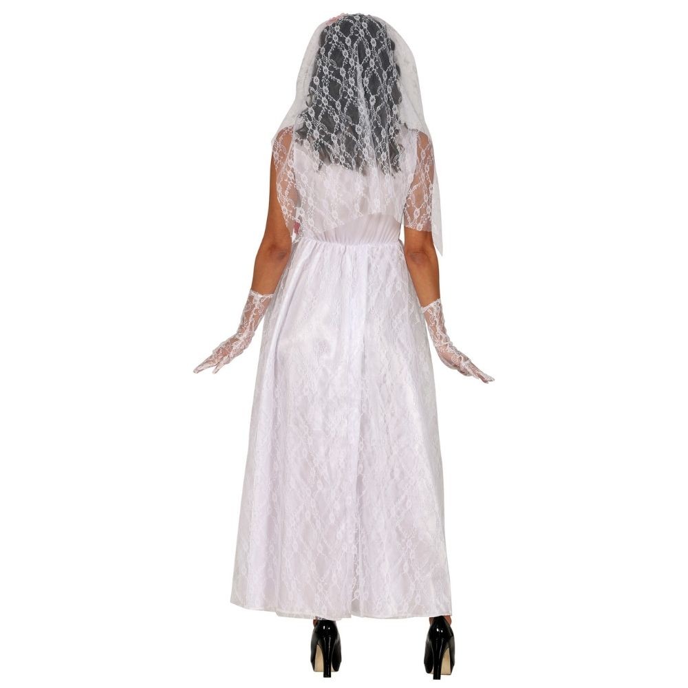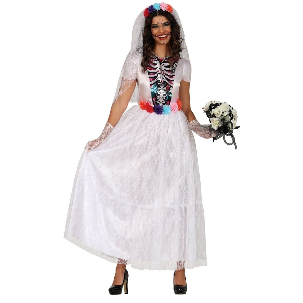 Réf. : ART-084503 Déguisement de mariée Catrina du Jour des morts, comprenant la robe ornée de dentelle et le serre-tête fleuri, pour un mariage éternel entre vie et mort. Gants et bouquet non inclus. Squelette imprimé et fleurs colorées rendent hommage aux âmes aimées dans la plus belle des traditions mexicaines. Idéal pour Halloween ou le Día de los Muertos.
