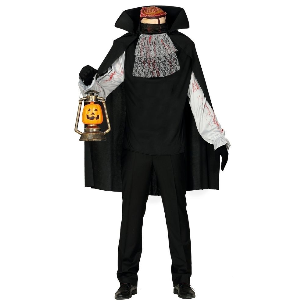 Réf. : ART-084504 Déguisement de cavalier sans tête pour homme, comprenant une longue cape noire à col montant, d'un haut à manches ensanglantées et d'un faux cou ouvert tranché, pour la soirée d'Halloween ou une fête à thème Cinéma. Lanterne citrouille non incluse. Ce costume joue l'illusion à la perfection pour un effet macabre et spectaculaire au premier regard.