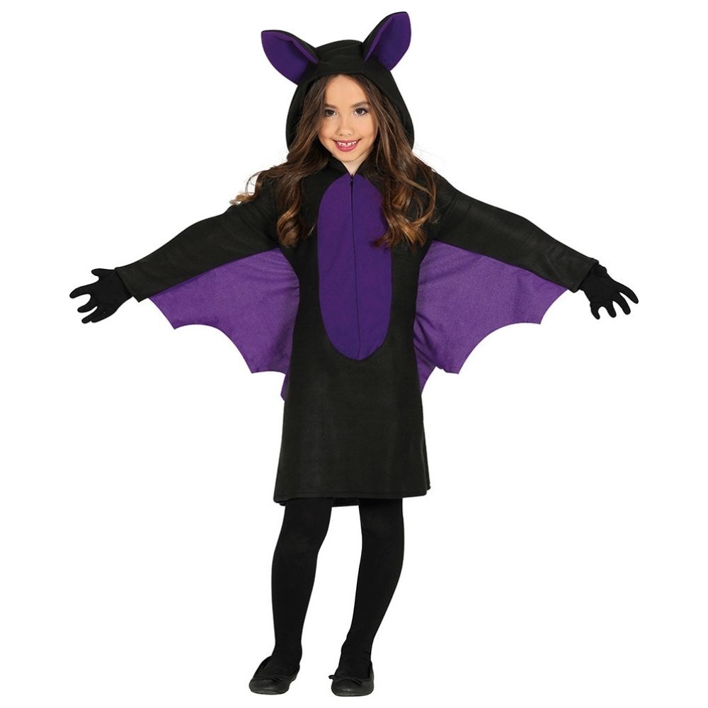 Réf. : ART-084509 Déguisement de chauve-souris fille composé d'une robe noire à fermeture zippée, d'ailes violettes intégrées et d'une capuche à oreilles pointues assorties pour une transformation en créature de la nuit au charme mystérieux. Avec son design doux et confortable, elle allie malice et élégance pour une envolée magique entre ombres et éclats lunaires.