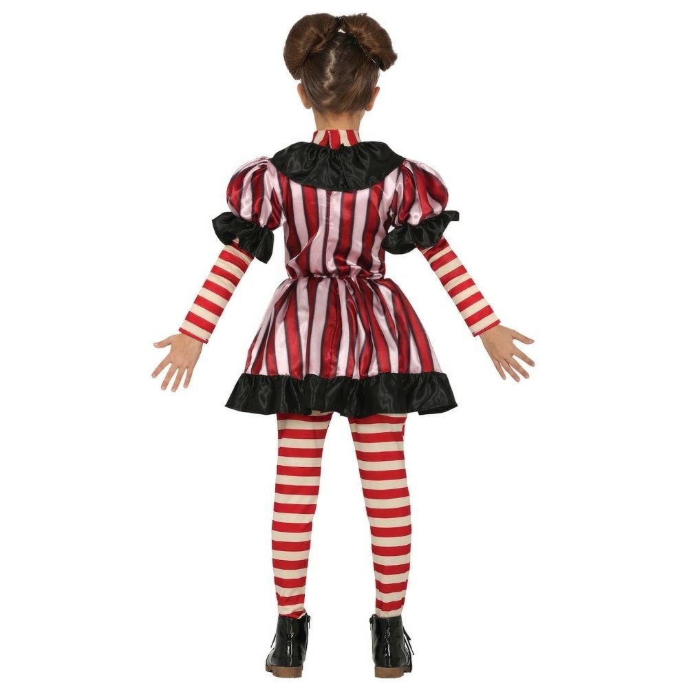 Réf. : ART-084516 Déguisement de clown vintage pour fille, composé d'une robe avec collerette et de collants, pour la nuit d'Halloween. Hache non incluse. Avec sa robe rayée asymétrique rouge et blanche, ses manches bouffantes, ses gros pompons noirs et ses volants sinistres, ce costume évoque les cauchemars d'antan. Parfait pour une incarnation en poupée clown maléfique tout droit sortie d'un vieux cirque abandonné.