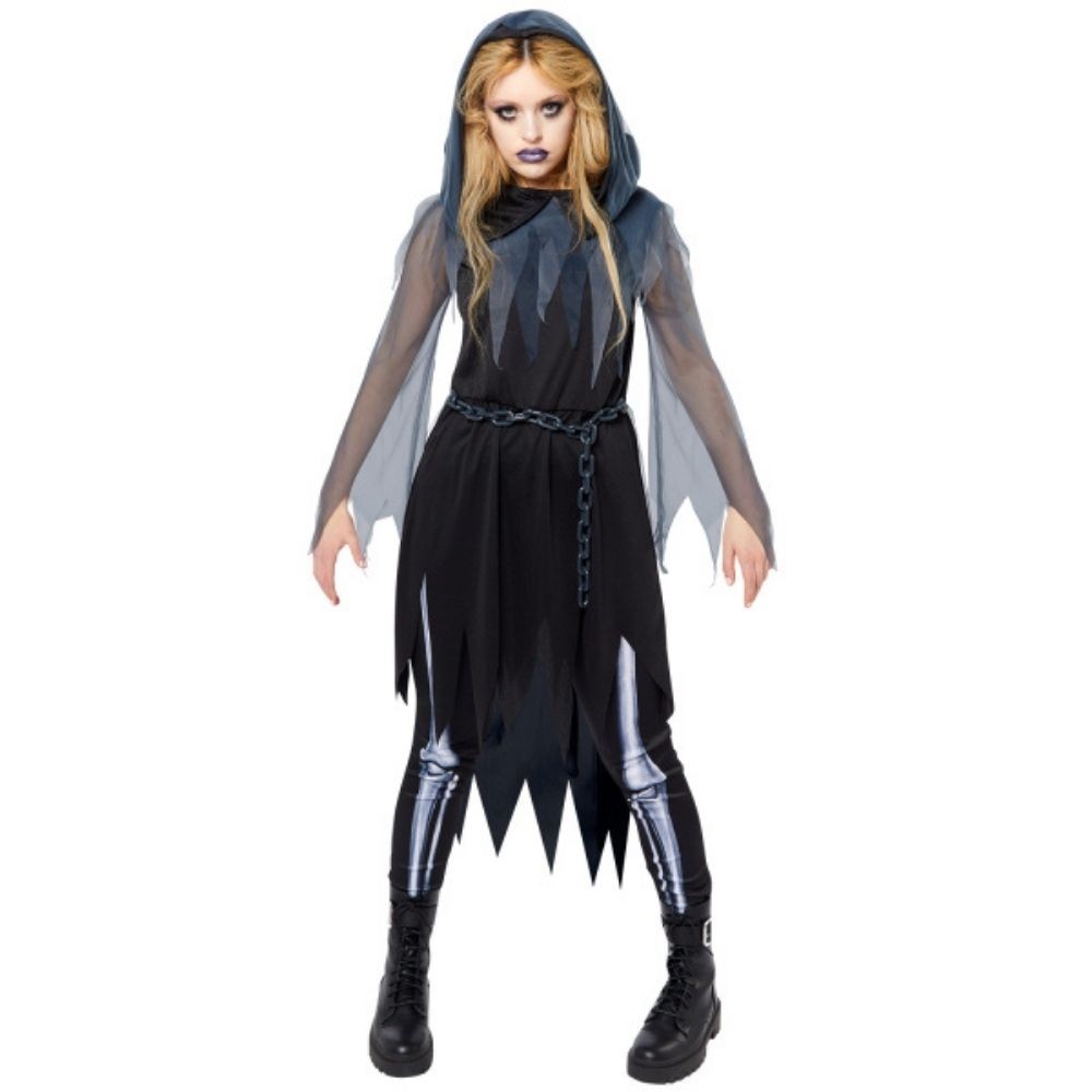 Réf. : ART-084194 Déguisement femme de faucheuse comprenant une robe noire déchirée, un voile à capuche vaporeux, une ceinture à chaîne sombre et un legging imprimé squelette, pour semer la terreur dans les couloirs sombres d'Halloween. Faux factice non incluse. Les manches transparentes ajoutent une touche spectrale. Ce costume évoque une apparition sinistre en quête d'âmes perdues dans la nuit.
