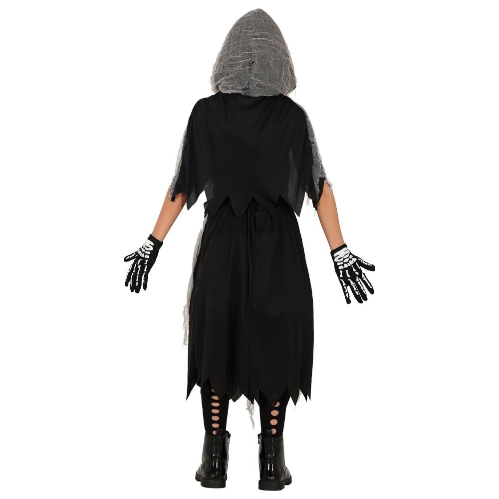Réf. : ART-084539 Déguisement de faucheuse squelette fantôme fille composé d'une robe noire ornée d'un torse osseux imprimé, d'un voile en gaze grise et d'une capuche mystérieuse. Faux factice, gants et collants non inclus. L'ensemble évoque une apparition spectrale venue hanter les ténèbres. Idéal pour incarner l'ombre d'Halloween, funèbre et poétique, prête à récolter les âmes dans un frisson de velours.