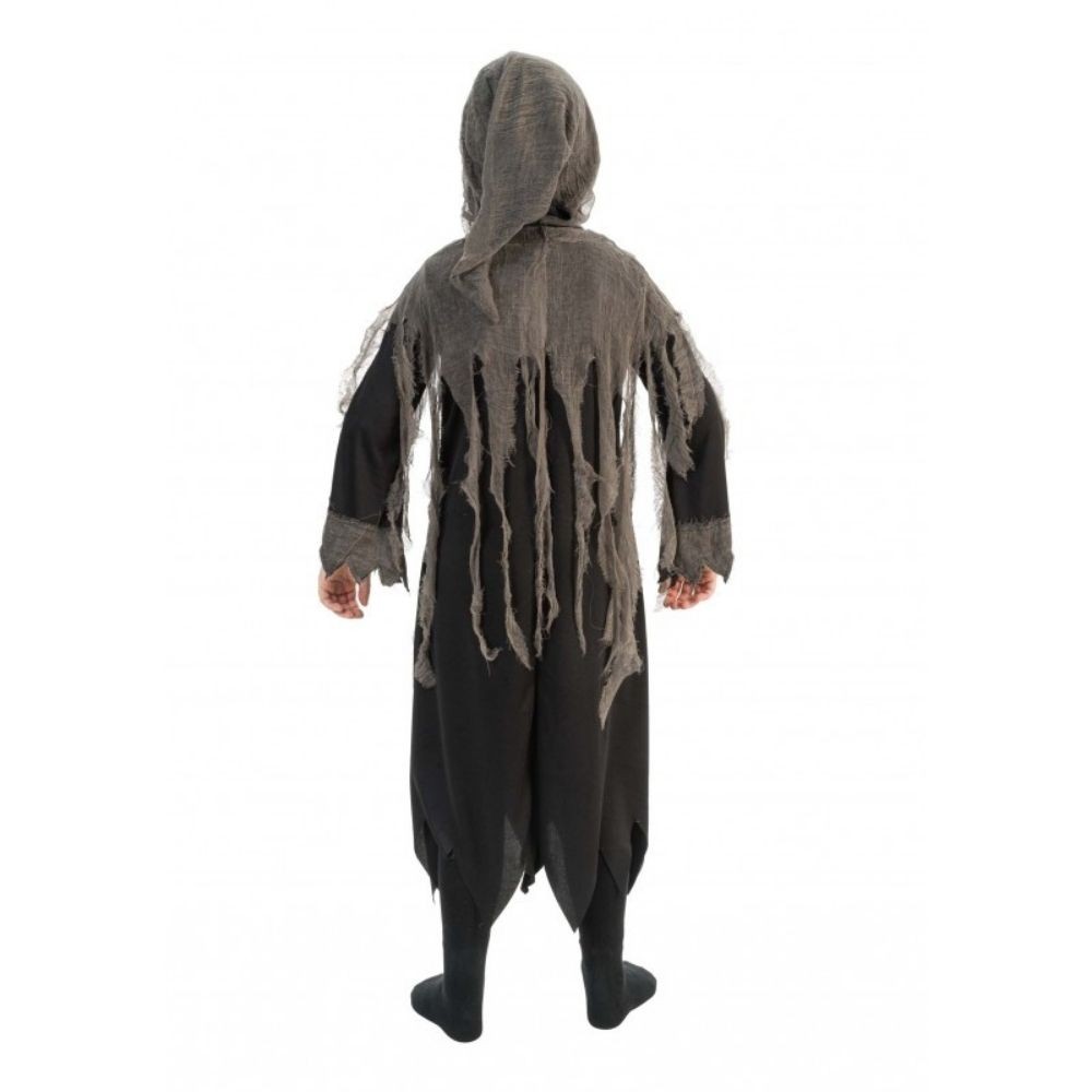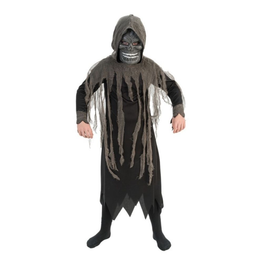 Réf. : ART-084111 Déguisement de la Faucheuse garçon comprenant la tunique, la capuche lambeaux et le masque. Collants non inclus. La robe est noire à bords dentelés. La capuche et le voile effilochés donnent un effet fantomatique. Le masque squelette en plastique noir complète le look d'une créature sortie des ténèbres. Parfait pour Halloween, il promet de semer la panique au moindre coup de vent dans la nuit !