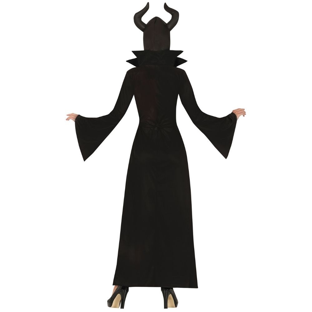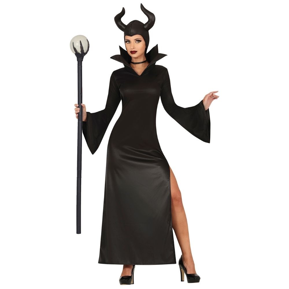 Réf. : ART-084543 Déguisement femme de fée maléfique, avec longue robe noire fendue et cornes majestueuses, pour jouer une méchante sorcière de conte fantastique. Bâton non inclus. Une allure ensorcelante pour incarner la magie noire et l'élégance obscure. Pour Halloween ou une soirée à thème, il est parfait pour une transformation en reine des ténèbres à la beauté envoûtante, maîtresse absolue du mal autoproclamée.