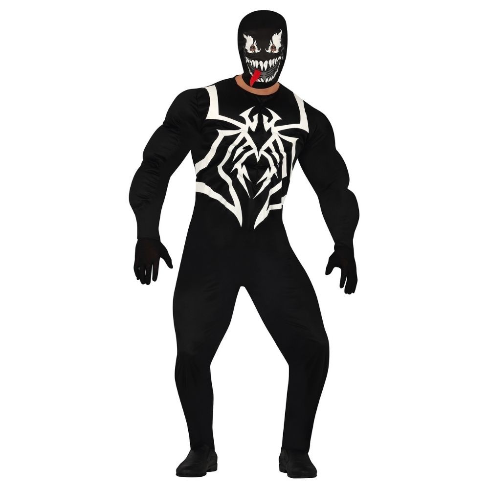 Réf. : ART-084547 Déguisement homme de héros fantastique araignée noire, avec combinaison musclée et masque terrifiant à grande bouche dentée, pour Halloween ou une soirée super-vilains. Gants non inclus. Inspiré d'un symbiote légendaire, ce costume incarne la force brute et le chaos. L'ombre de la toile plane sur la fête...